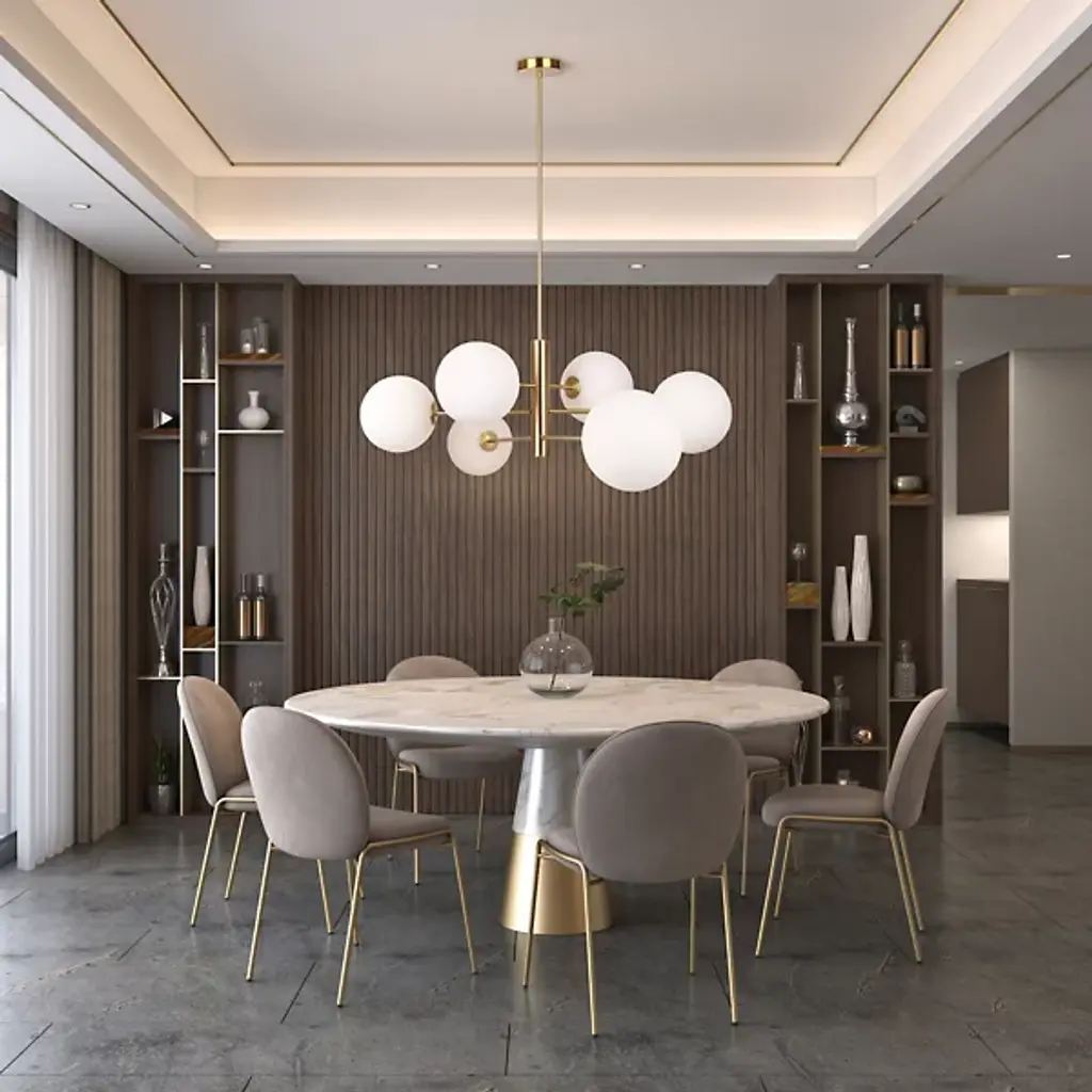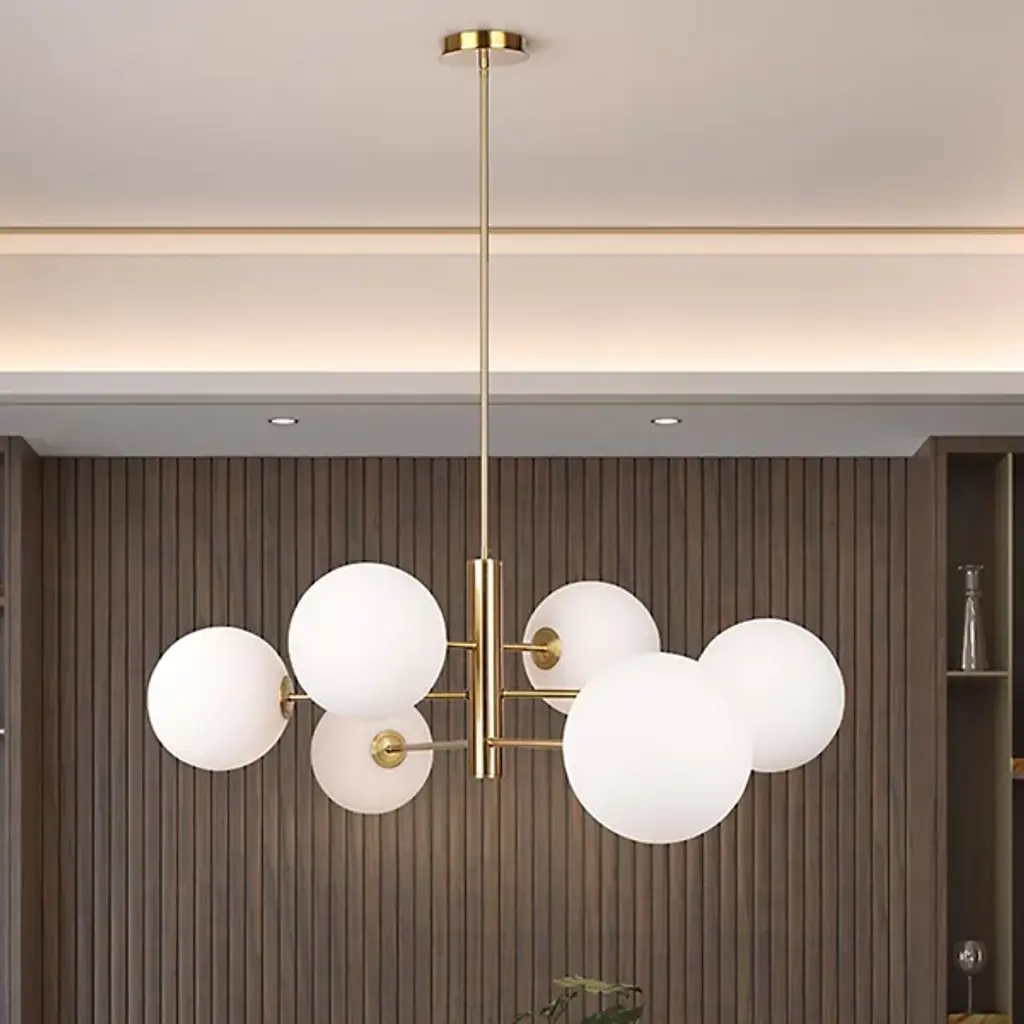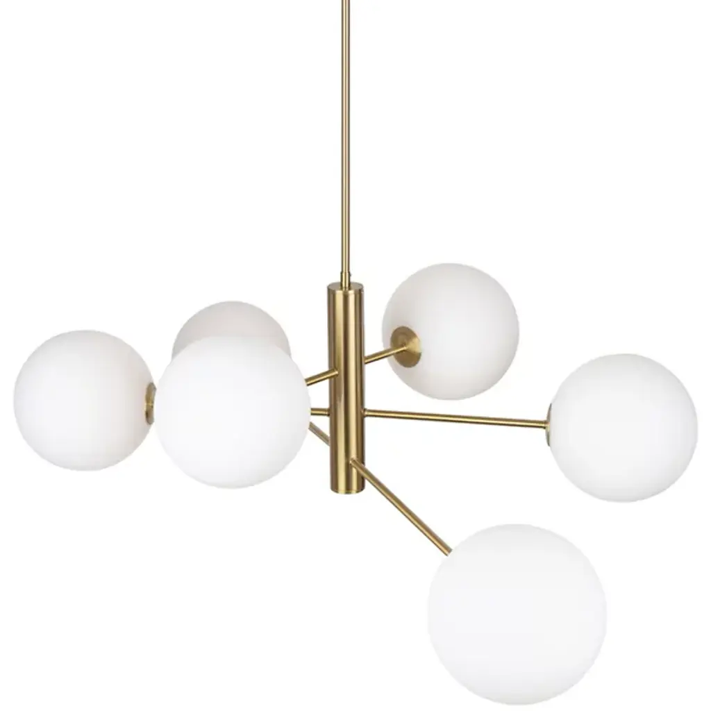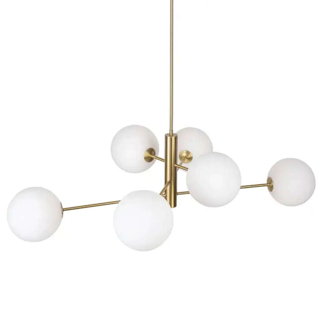 Experience the captivating allure of the Aurelia Chandelier from Artcraft, which radiates contemporary charm with its brushed brass frame exuding warmth. Each arm adorned with spherical white glassware creates a striking contrast, emitting soft, inviting illumination. This product seamlessly blends sleek design with a cozy aesthetic, making it a stylish and captivating addition to any space where modernity meets comfort in perfect harmony, elevating your ambiance with its enchanting presence.