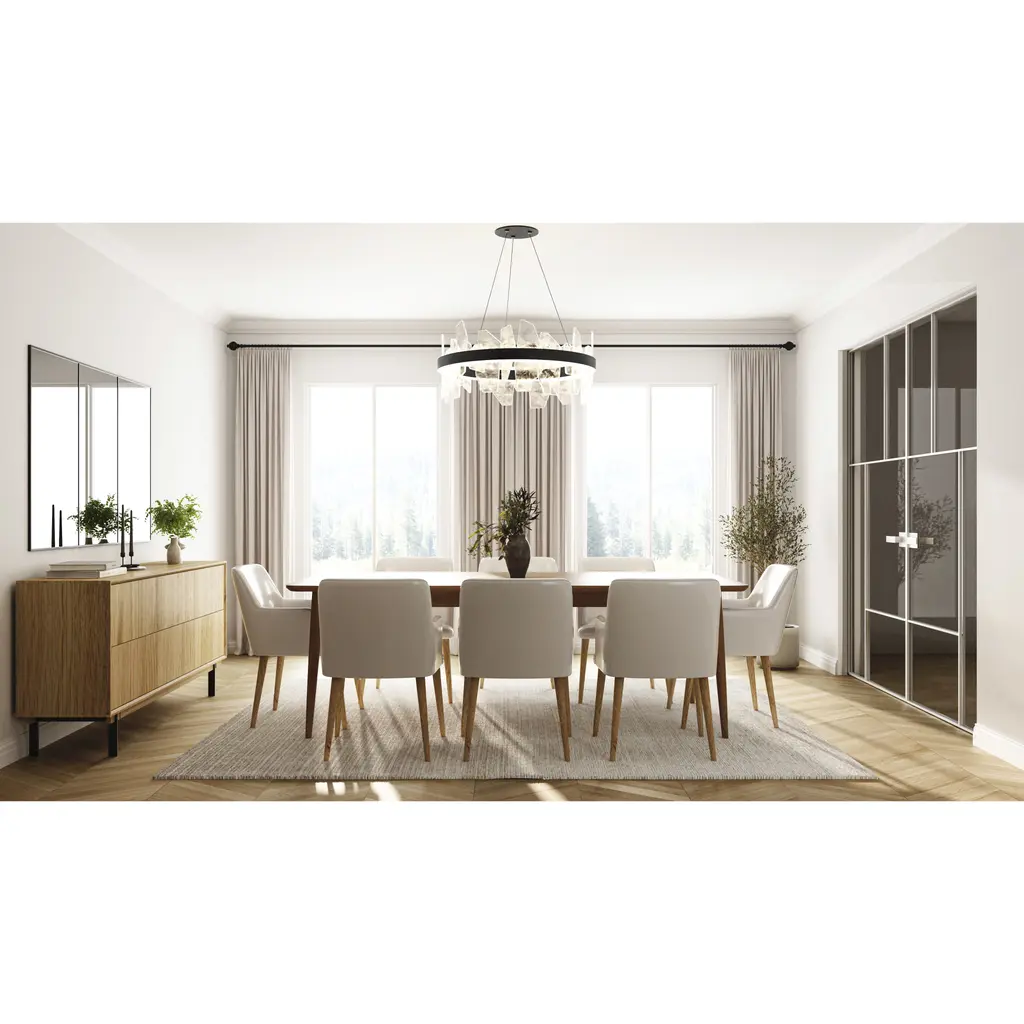 Discover the epitome of luxury with Aurelia, a standout piece from the Platinum by Quoizel collection. Merging modern style with opulent details, this stunning light fixture features white swirl glass in varied shapes, each piece offering unique visual intrigue. Choose from two striking designs: a round chandelier for a bold statement in your dining or living area, or a linear island light to enhance the elegance of your kitchen or bar. Available in sophisticated matte black or soft gold, Aurelia adds a touch of glamour to any space.