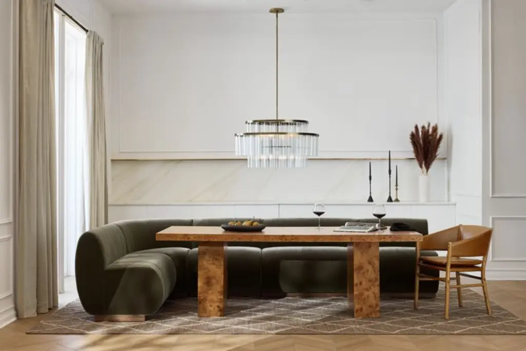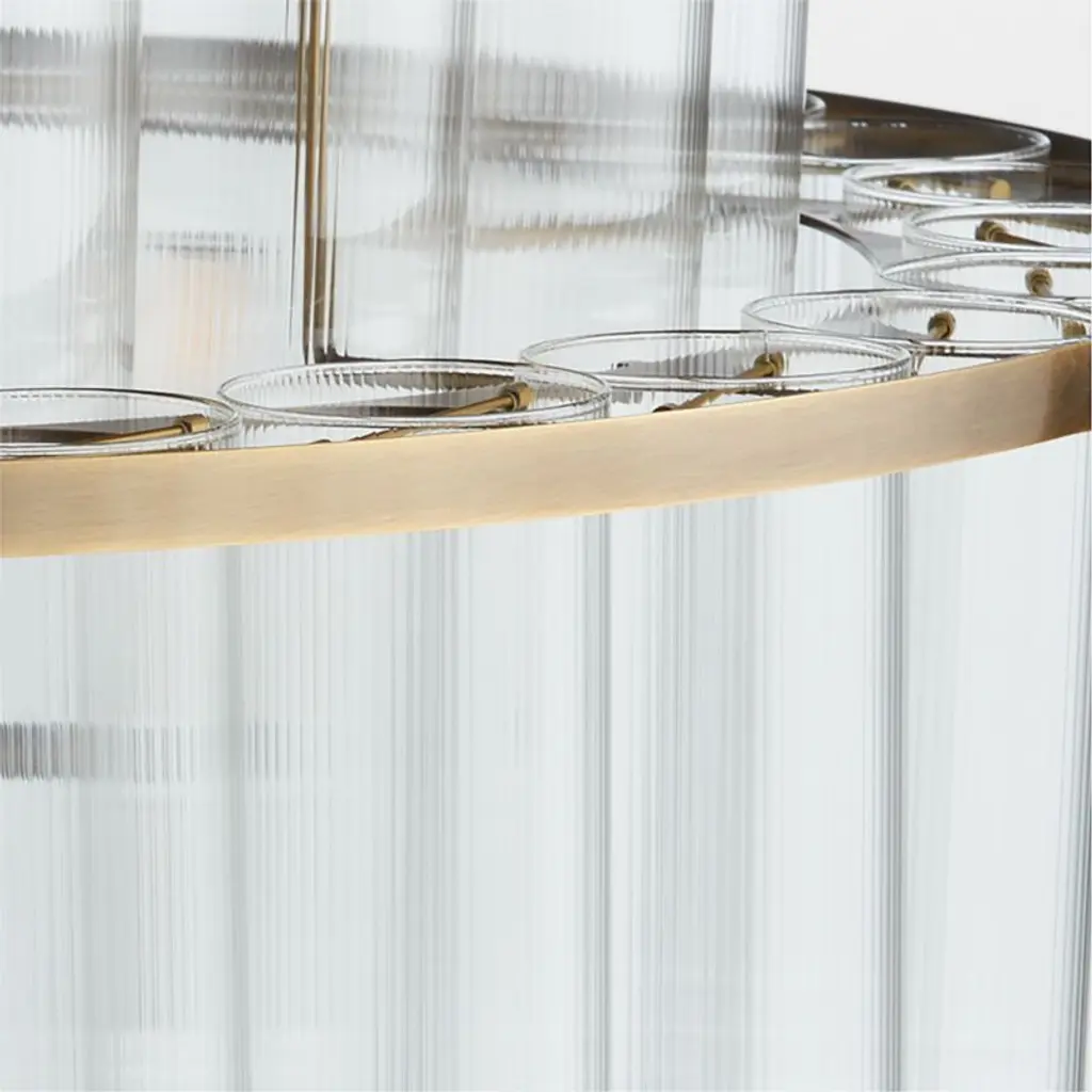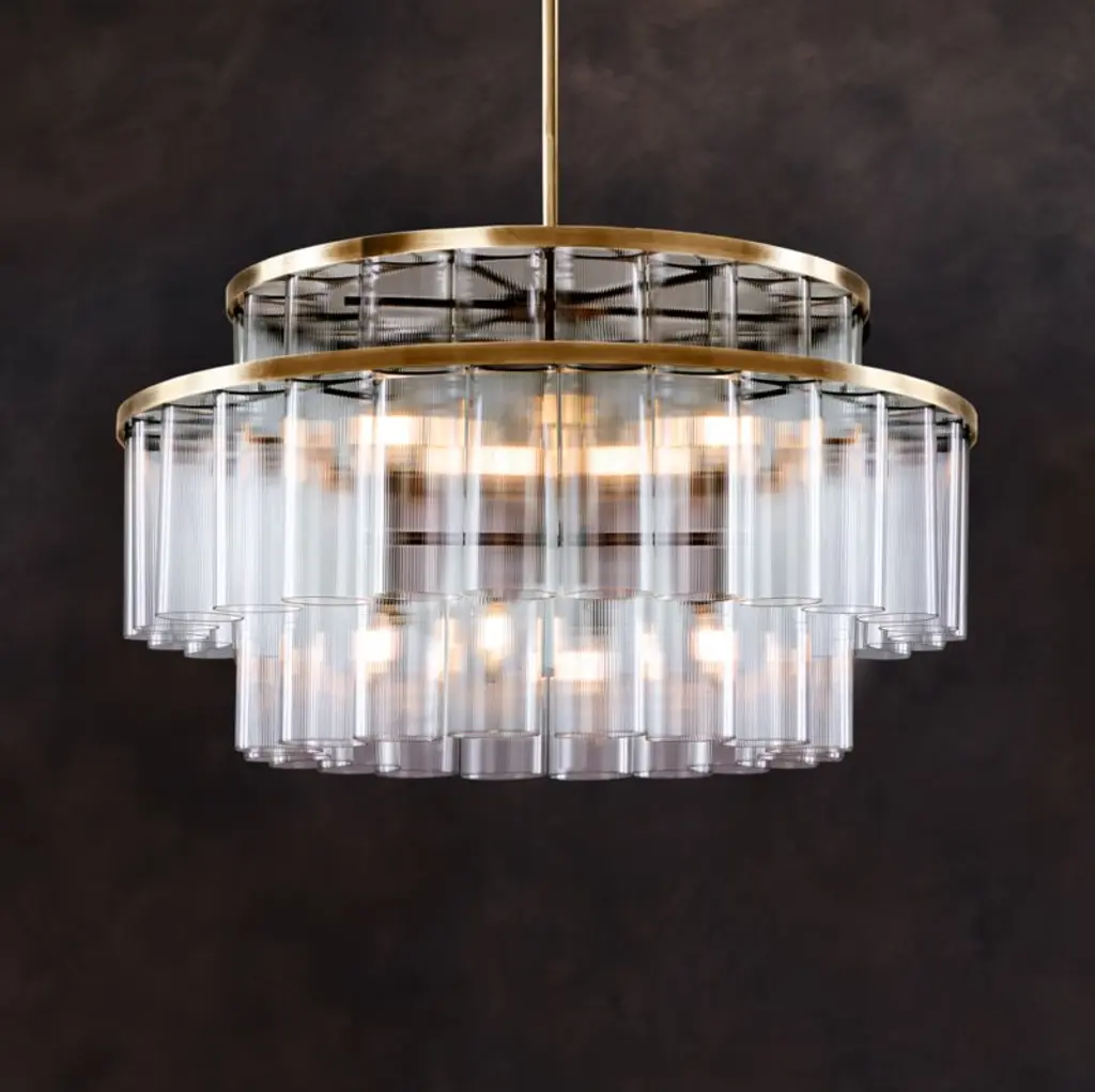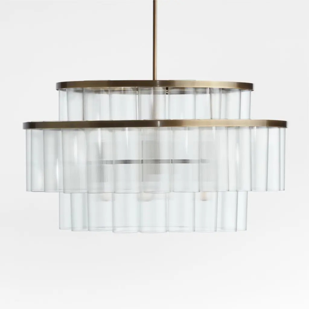 Inspired by mid-century modern Finnish and Italian lighting design, our Aurora chandelier offers a contemporary play of light through glass. Tiers of subtly fluted glass tubes layer to filter light, creating a gentle glow. Slender frames finished in burnished brass add gleaming warmth without blocking illumination. This stunning chandelier shines as the centerpiece of an entryway, dining room or living room.