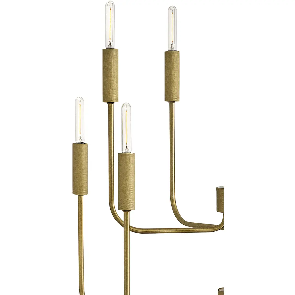 Austens slim, exaggerated design creates a chic transitional shape accentuated by knurled candle sleeves and stem details. Black and Lacquered Brass finishes are complemented by exposed bulbs. Experiment with different lamps to find a look thats perfect for your space.