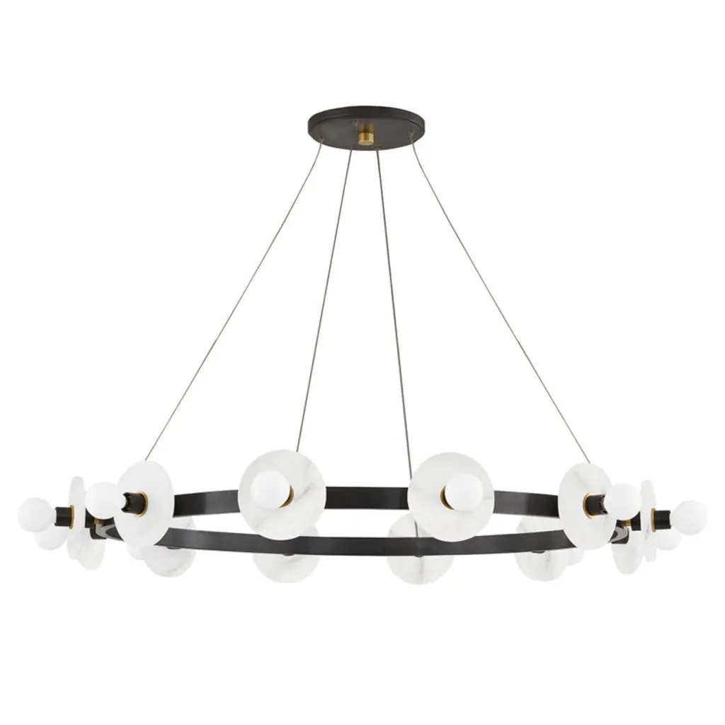 Give your home décor an elegant centerpiece with the Austen 2 Tier Chandelier by Hudson Valley Lighting. A refined silhouette is given a modern look with two slender metal rings suspended from a circular canopy by thin cables. Natural alabaster discs decorate the exterior of each ring, bouncing light from incandescent bulbs set in front of each one. The piece’s open and airy aesthetic adapts to a range of interiors, while its natural stone accenting brings an organic quality to its environment.