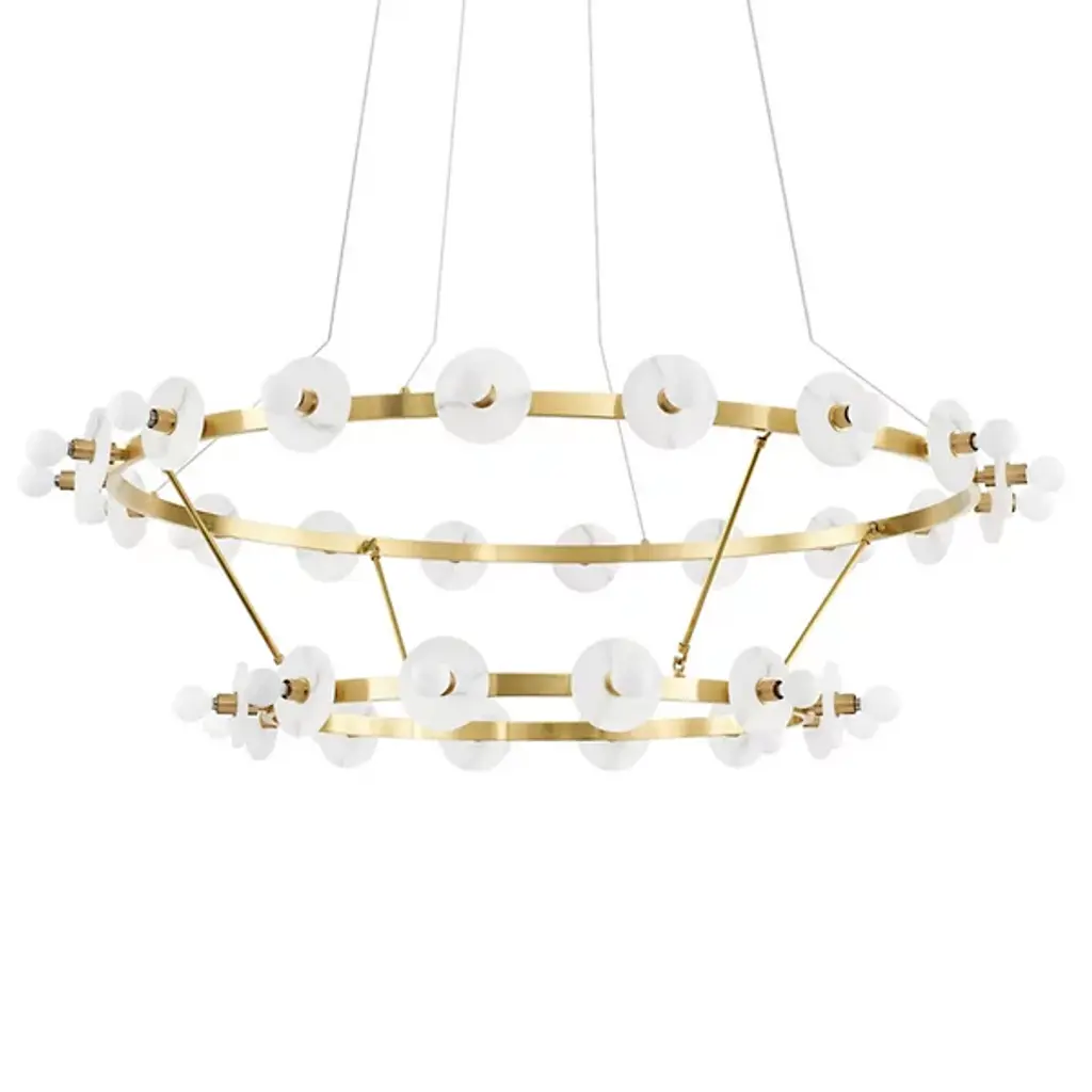 Give your home décor an elegant centerpiece with the Austen 2 Tier Chandelier by Hudson Valley Lighting. A refined silhouette is given a modern look with two slender metal rings suspended from a circular canopy by thin cables. Natural alabaster discs decorate the exterior of each ring, bouncing light from incandescent bulbs set in front of each one. The piece’s open and airy aesthetic adapts to a range of interiors, while its natural stone accenting brings an organic quality to its environment.