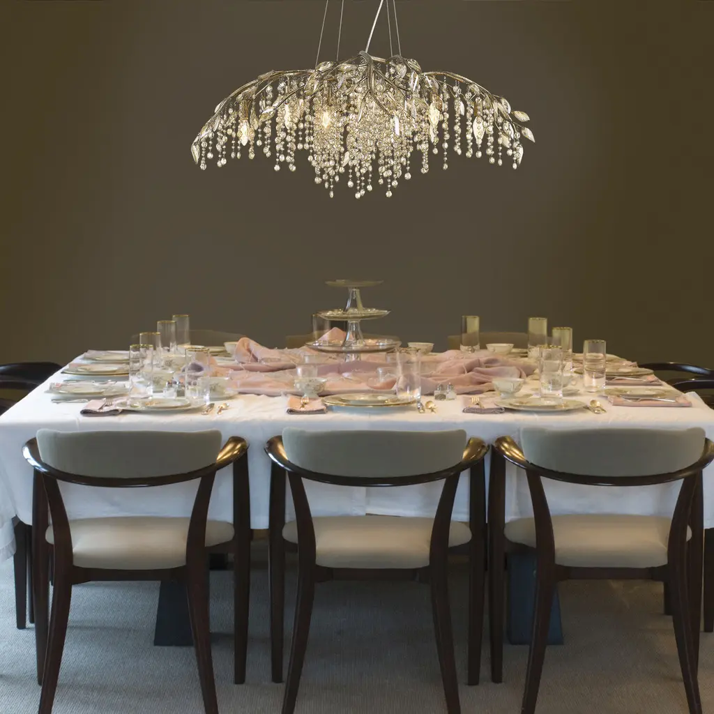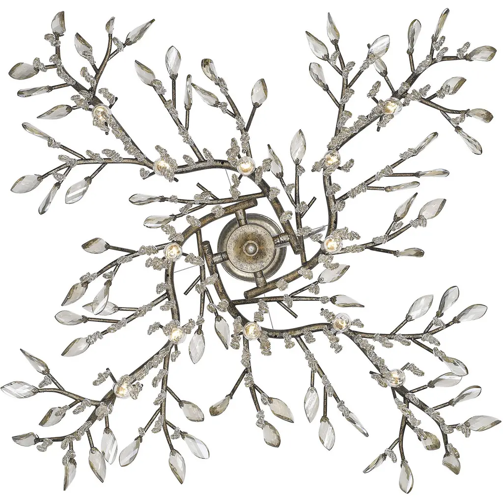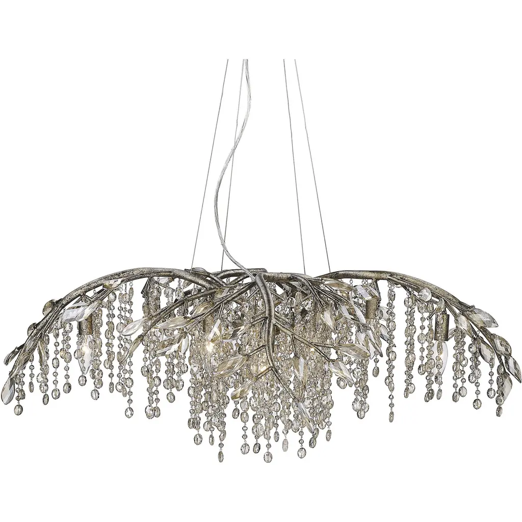 Bring gothic romance into your home with the Golden Lighting Autumn Twilight 12-light Chandelier. This captivating piece transforms organic forms into a breathtaking display with delicate crystals cascading like droplets from hand-forged metal branches. With no shade, the chandelier allows light to dance freely, enhancing its beauty in any setting. The mystic gold finish features a unique, weathered appearance that tells a story, adding warmth and charm. Ideal for dining rooms, foyers, or elevating bedrooms, this chandelier is dry location rated for indoor use and is adjustable for your space. Overall dimensions measure 40"W x 15.5"H x 40"D and require 12 E12 candelabra base bulbs (not included, max 60 wattage). Elevate your interior with this exceptional piece that embodies style and quality.