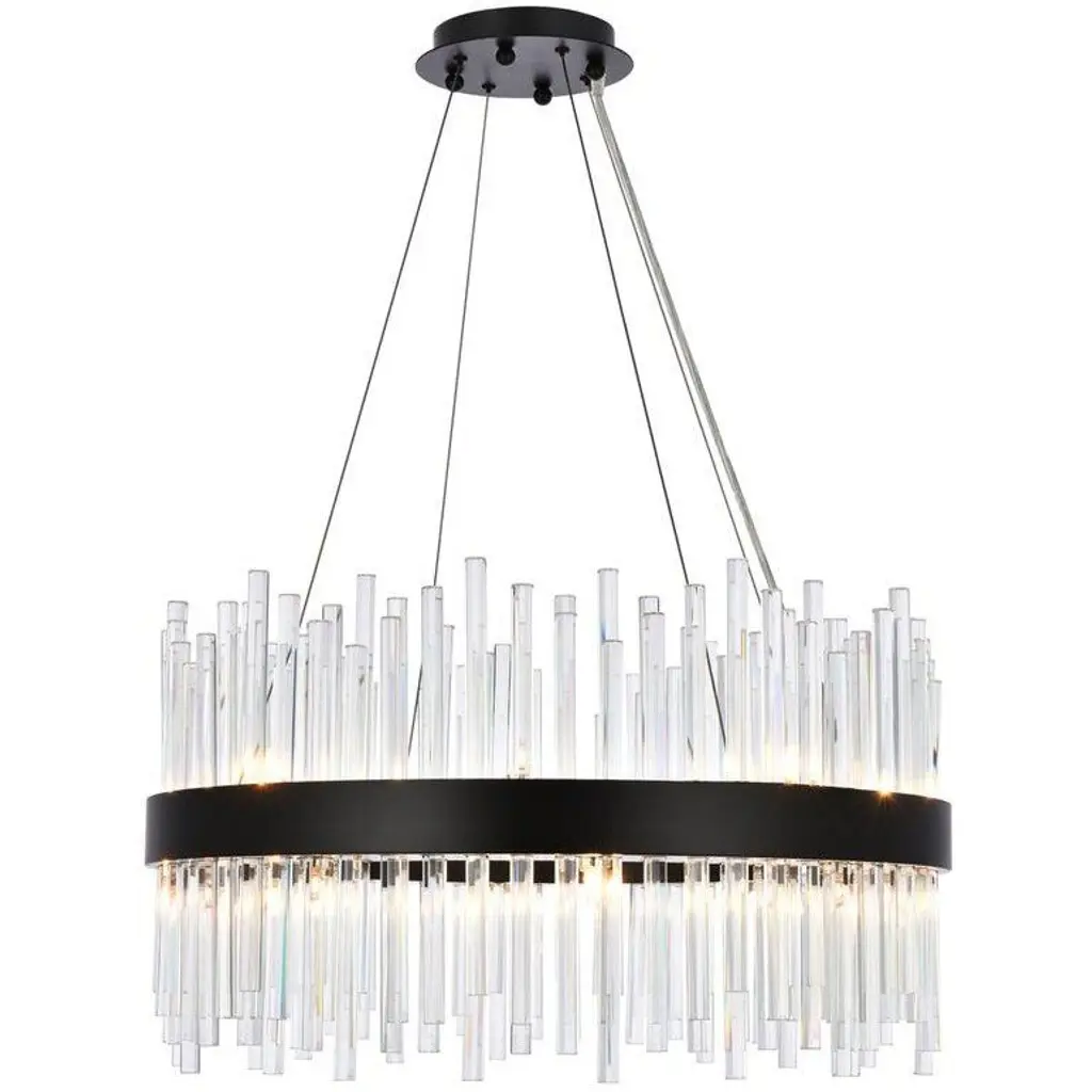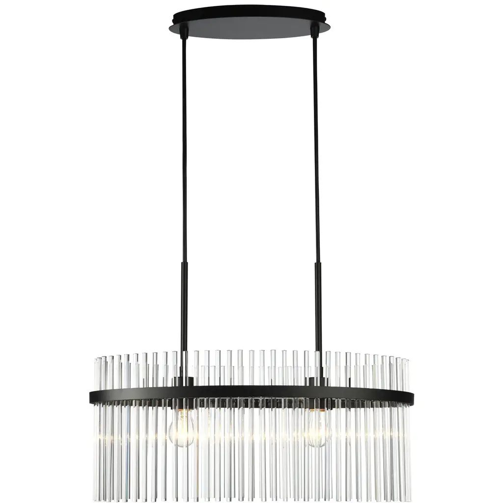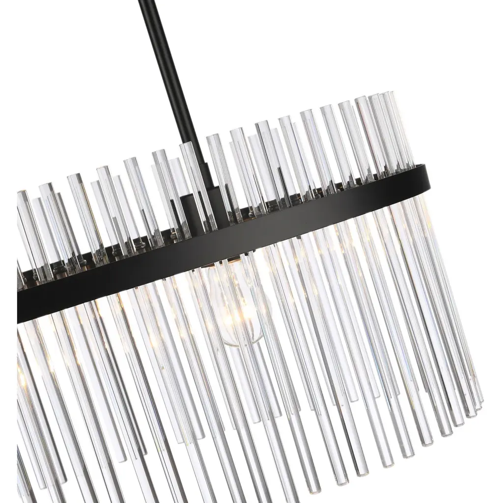 The Ava Collection oval chandelier enchants with its delicate arrangement of circular glass rods, elegantly suspended on a sleek black frame. Its versatile design harmonizes beautifully with both circular and rectangular tables, adding a touch of refined glamour to any room. (This model is easily height adjustable to meet you preference)