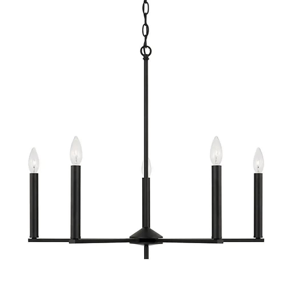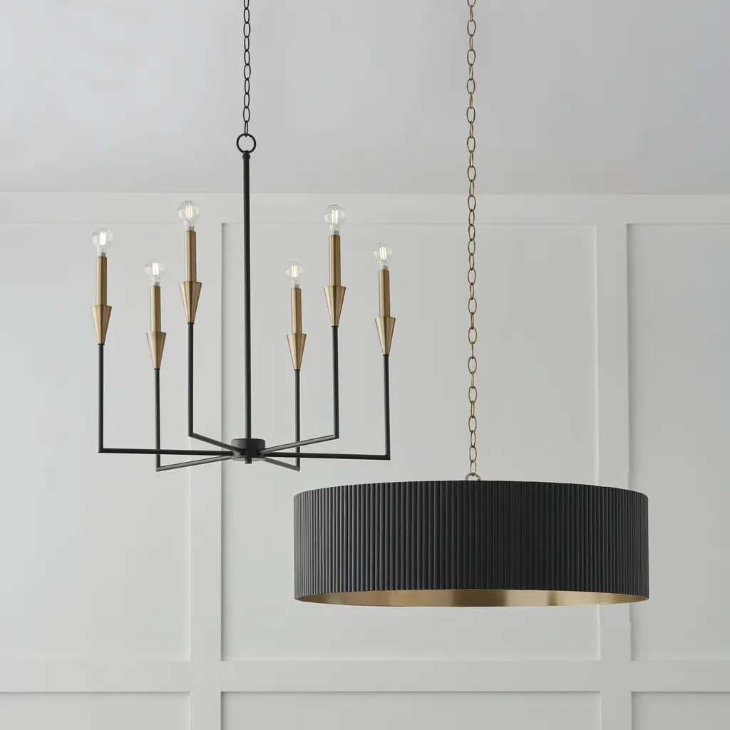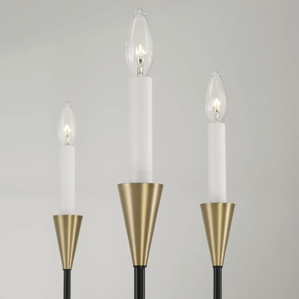 Create striking elegance with the Avant Small Chandelier. The pointed Aged Brass bobeches and squared Matte Black arms evoke a stunning, distinct style, while the interchangeable Aged Brass or Matte White candle sleeves offer a tailor-made feel.