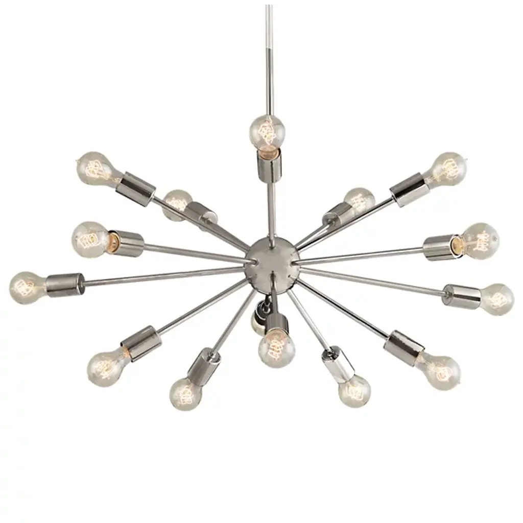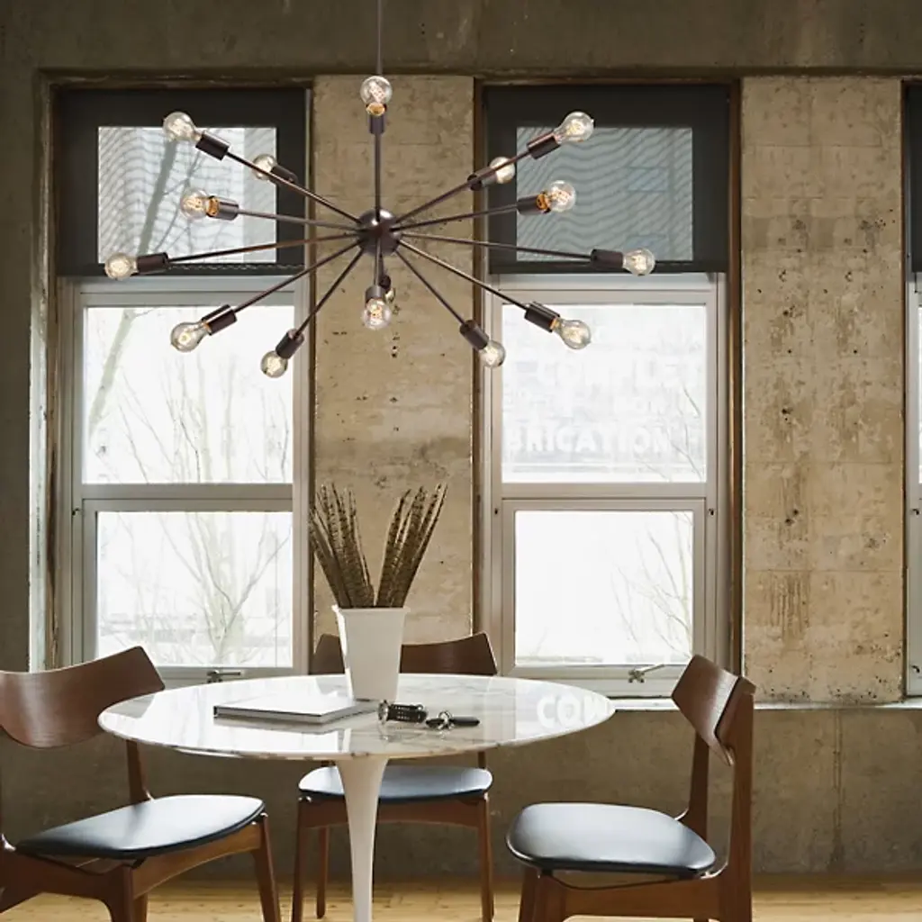 A striking variation on a true mid-century favorite, now remade for the contemporary home. The Axion 15-Light Chandelier by Justice Design is made with a cool Sputnik-inspired profile with an outward look that makes it a handsome centerpiece in entryways, dining areas, living rooms and more. This fixture is framed in hand worked Metal with a round core and outward rod motif that meets all of your design needs. Each rod houses part of an ensemble of 15 individual unadorned light bulbs with a vintage filament style look. It’s a handsome showcase piece you're sure to love for years to come.