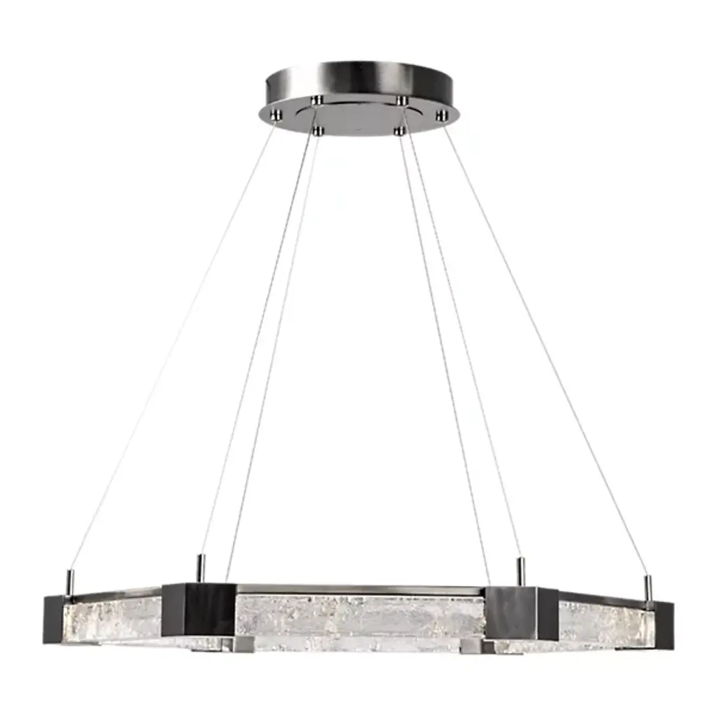 Amplify your indoor illumination with the artful presentation of the Axis Hexagonal LED Chandelier by Hammerton Studio. It was designed by Levi Wilson in 2020 and uses a stepped disc ceiling mount to suspend a larger hexagonal ring from above. Each straight section is formed from a translucent bar of artisan-cast glass, joined to each other by metal housings that hold integrated LEDs oriented both downward as well as outward through the glass for a gentle ambiance that emanates from a geometrical form.