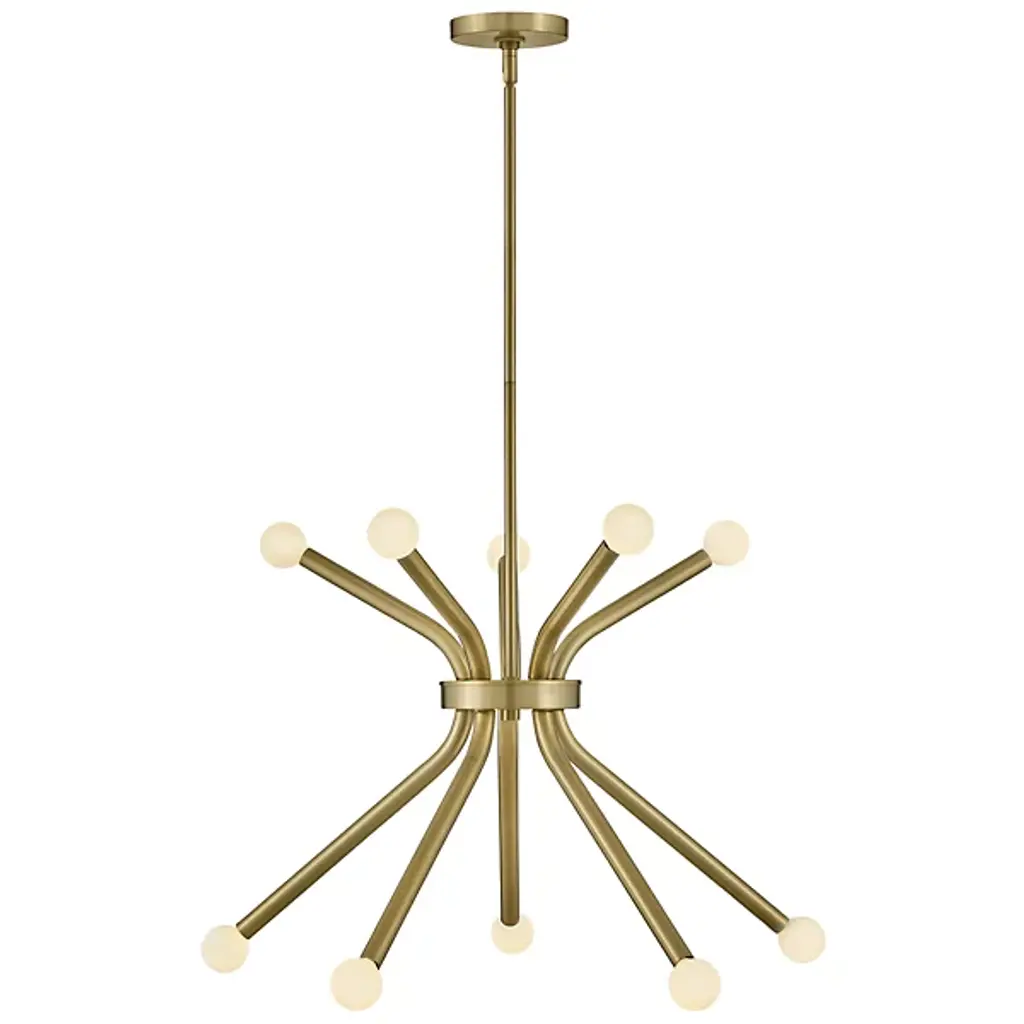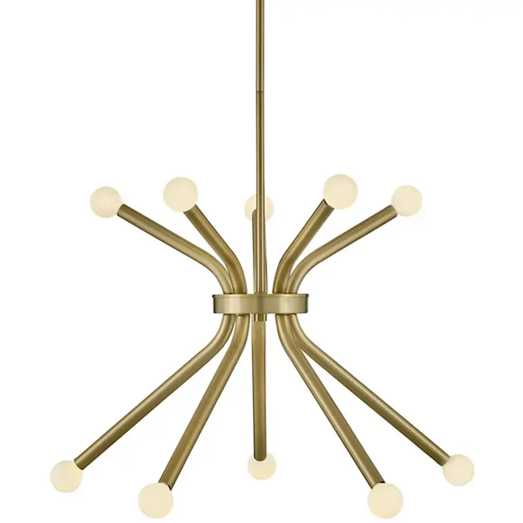 Bright, energetic, whimsical. Excite the room with a starburst display of the Axton Chandelier from Lark. This focal point shows its mid-century modern inspiration with charming shapes and rich finishes. It hangs with a slender suspension that can be appreciated as a single or series. A ring body appears to cinch a group of arms. These arms explode visually with generous curves. Each end of the arm is home to a bulb. These layered bulbs stream up an atmospheric light and send down a soft cast glow.