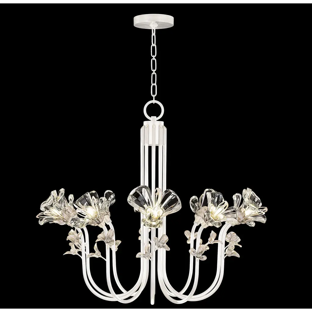 This collection is inspired by the craftsmanship of fine jewelry, runway fashion trends, and the beauty of nature itself. Its name is short for Azucena, a "Madonna Lily" in Spanish. This silver leaf chandelier features a flirtatious interplay of crystal