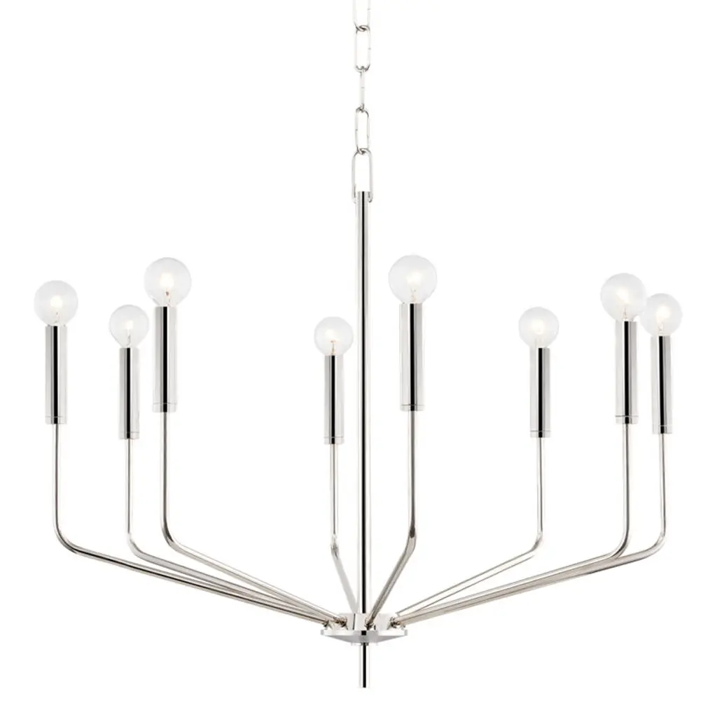 Bailey is not your traditional candelabra—in fact, she's had quite the glow up. Svelte arms extend upwards to greet metal candlesticks and globe bulbs, all hanging gracefully from a delicate chain. Designed with you in mind, Bailey is available in six, eight, or 15-light options. Working with a long dining room table? Place two of the six-light versions at least 2.5' apart. Finish options include aged brass, polished nickel, and soft black.