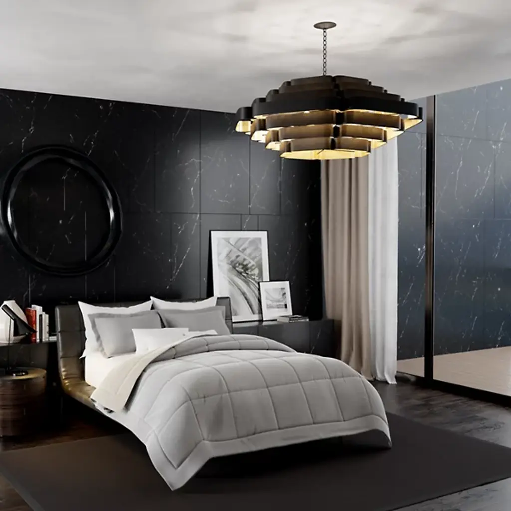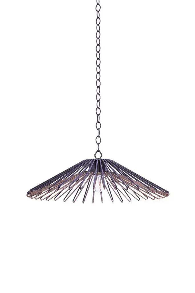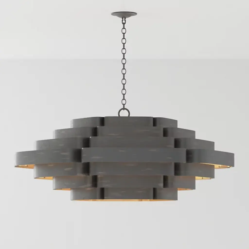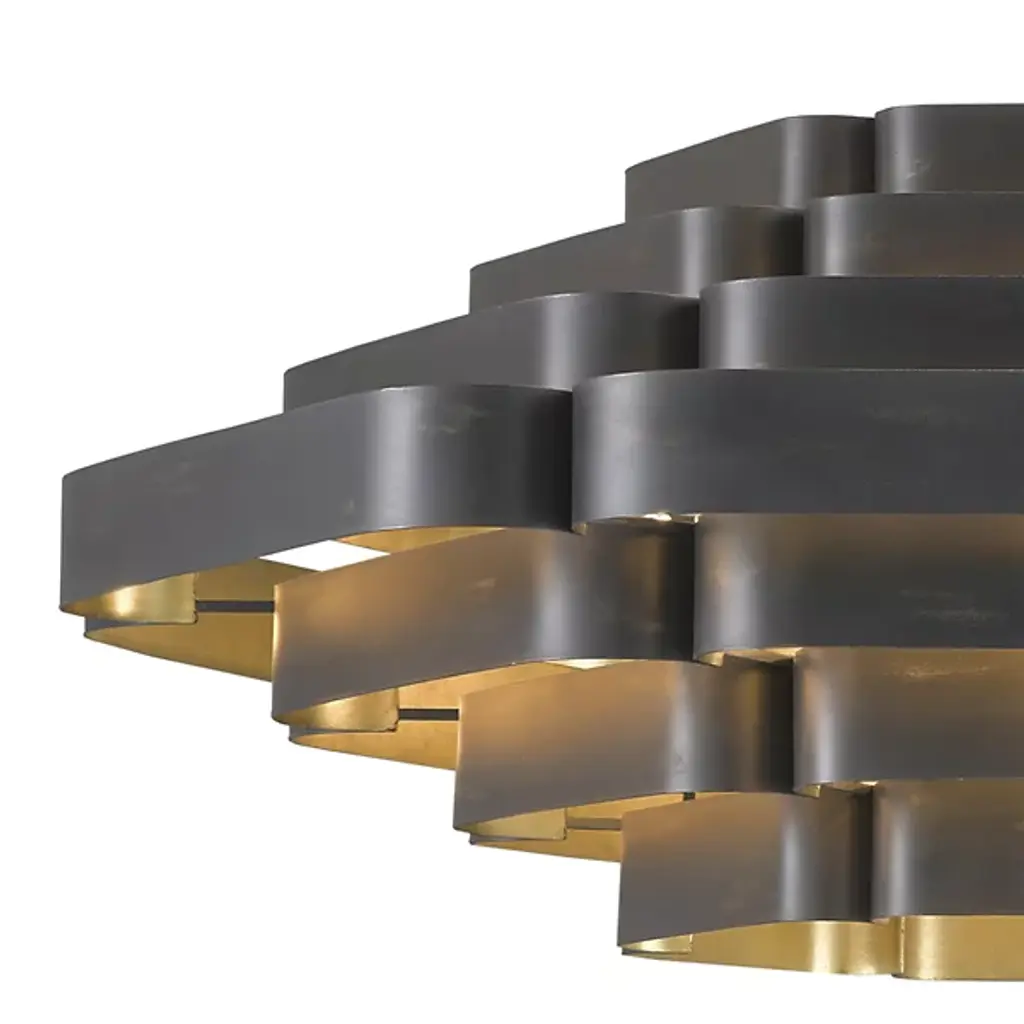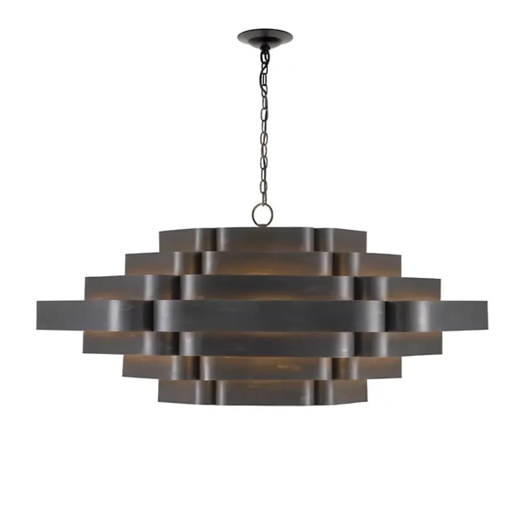 The Bailey Chandelier by Currey & Co is a cool, contemporary piece from interior designer Bunny Williams. Suspended by a linked chain, this chandelier is made from a tiered arrangement of wrought iron ribbons that light radiates from between for a dynamic, daring look that illuminates a room with a beautiful glow. A bold finish dresses up this design as it makes a statement and creates a warm, welcoming environment wherever it is installed.