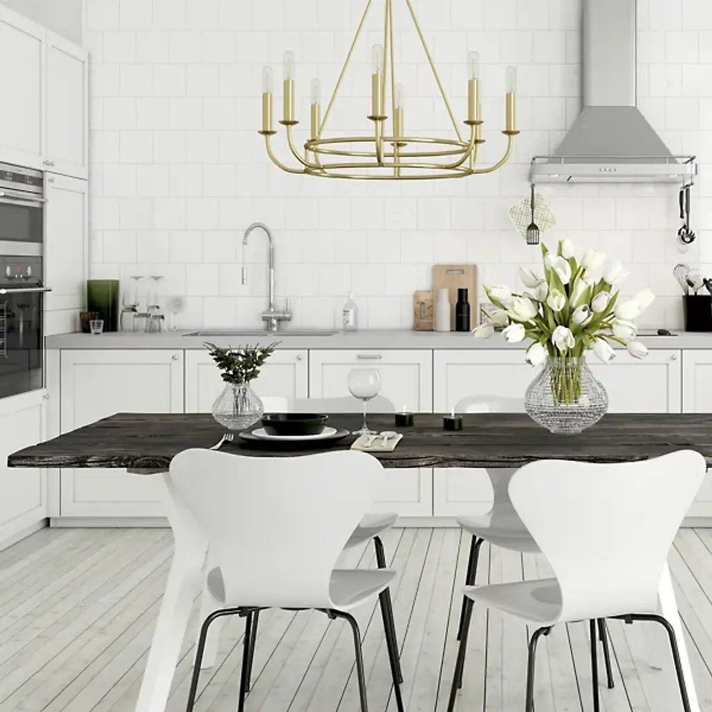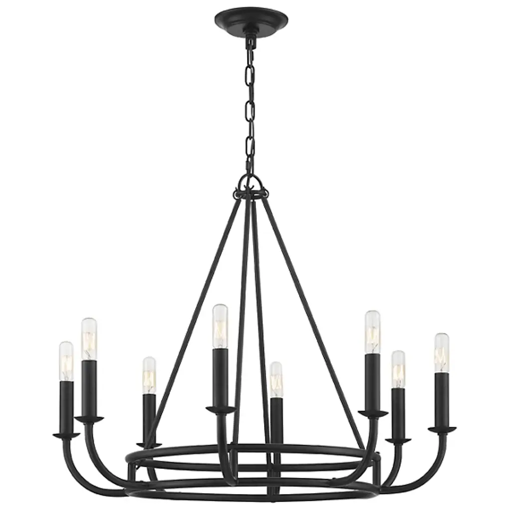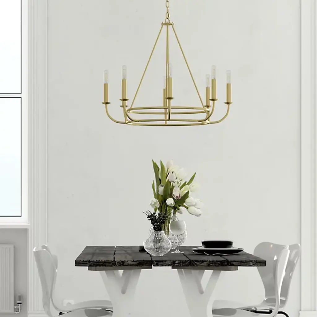 The Bailey Chandelier from Crystorama takes the essential beats of a traditional chandelier and refines them to give you a clean aesthetic brightened up by gorgeous light. It shows its modern character in its use of clean contours and graphic shapes. In a foyer or dining room, this piece makes a statement as a crescendo of lines angles elegantly at the center. Swooping up from the ring structure below, trim lamp holders stand with a classic feel defined by their familiar bobeche dish accents. The openness of the overall piece makes it easy to follow, giving comfort to the eyes. With bulbs dotting the top, the piece creates a glorious glow, silhouetting its structure with a touch of drama.