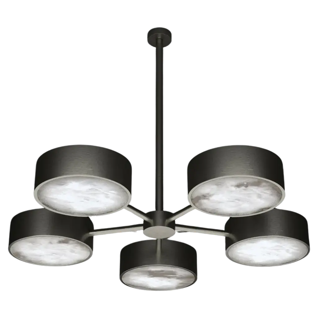 The Balance Chandelier is a stylish lighting fixture that showcases a sleek, contemporary design. Black steel rods support a collection of six alabaster discs, nested within steel rings in a Champagne Silver finish. Each steel rod is affixed with one light on each end, creating an asymmetric look. The natural alabaster stone gracefully diffuses the light, providing a wealth of illumination.