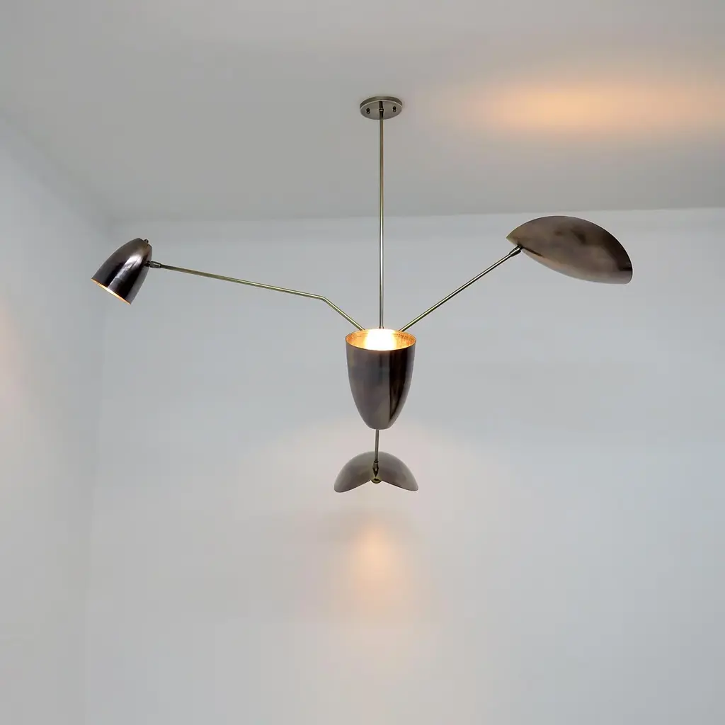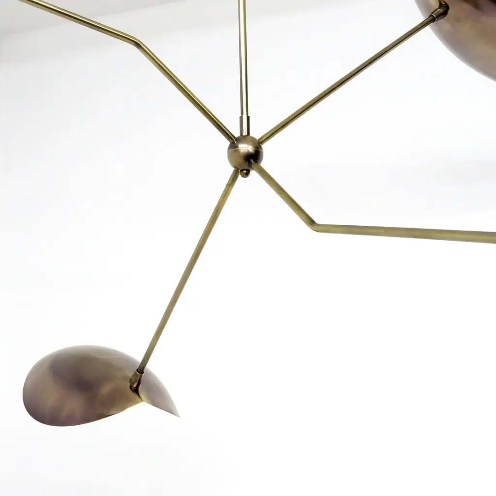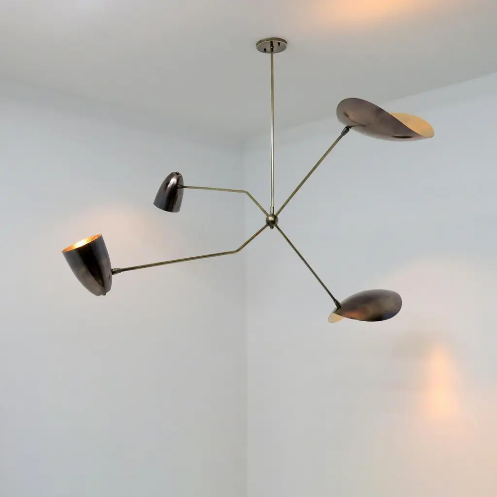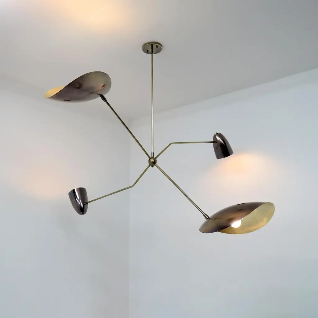 Elegant aged brass chandelier by Gallery L7, handcrafted and finished in Los Angeles from American brass, with four brass arms carrying two adjustable up- and down lights (cones and shells) each, top and bottom pairs of arms can rotate independently around the center, suspension height can be adjusted per request. Four E26 sockets per fixture, max. wattage 60w each or LED equivalent, wired for US standards or European standards (110v/220v), UL listing available upon request for an additional charge, bulbs are provided as a one time courtesy.