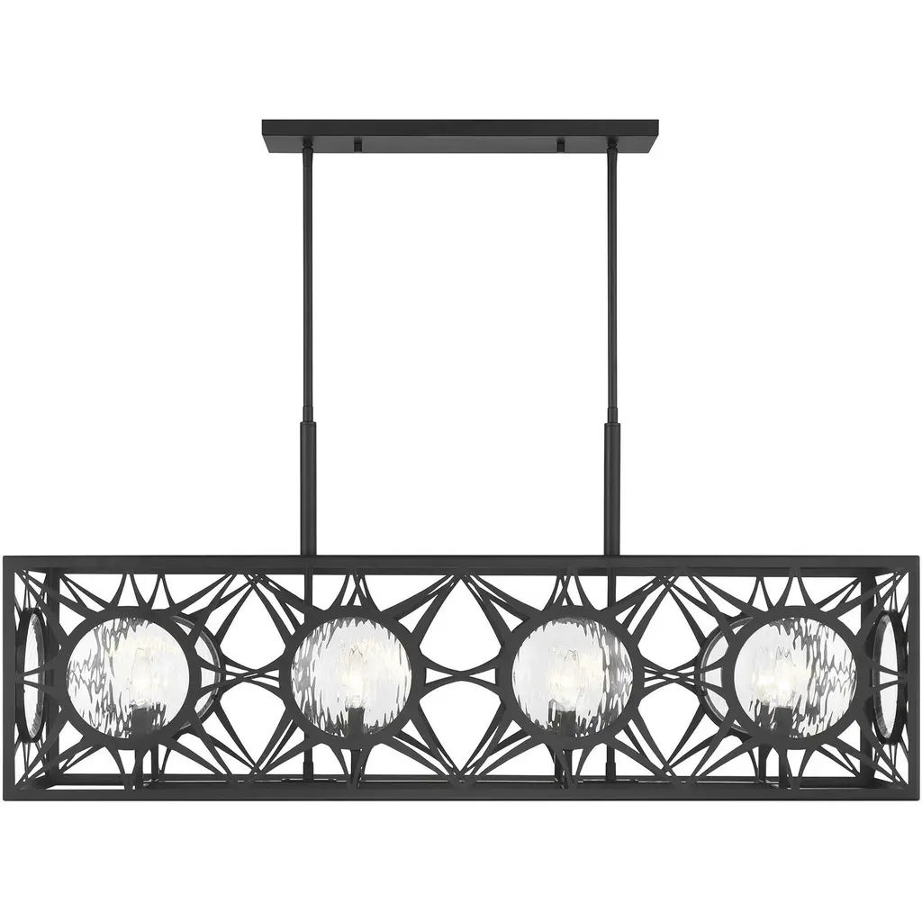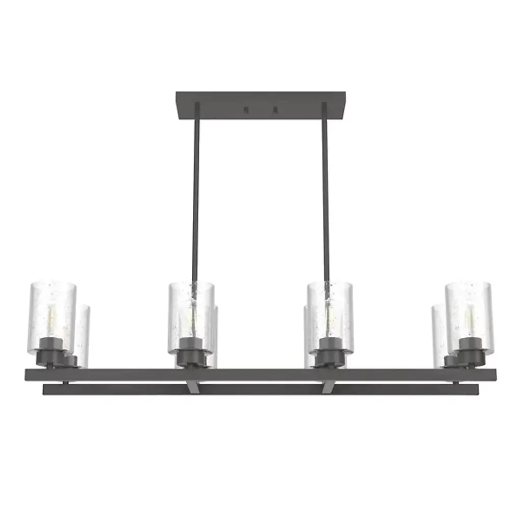 Let your sense of style shine through with the beautiful Balfour 8-light linear chandelier from Savoy House Its rectangular structure wears a Matte Black finish and is decorated with eye-catching starburst patterns that hold circular panes of clear water glass. Balfour is 44" in length, 12.88" in width and has an adjustable height ranging from 19.75" to 73.75". It uses eight candelabra size bulbs of up to 60 watts per bulb. Bulbs not included. Comes with eight 12" downrods and two 6" downrods.