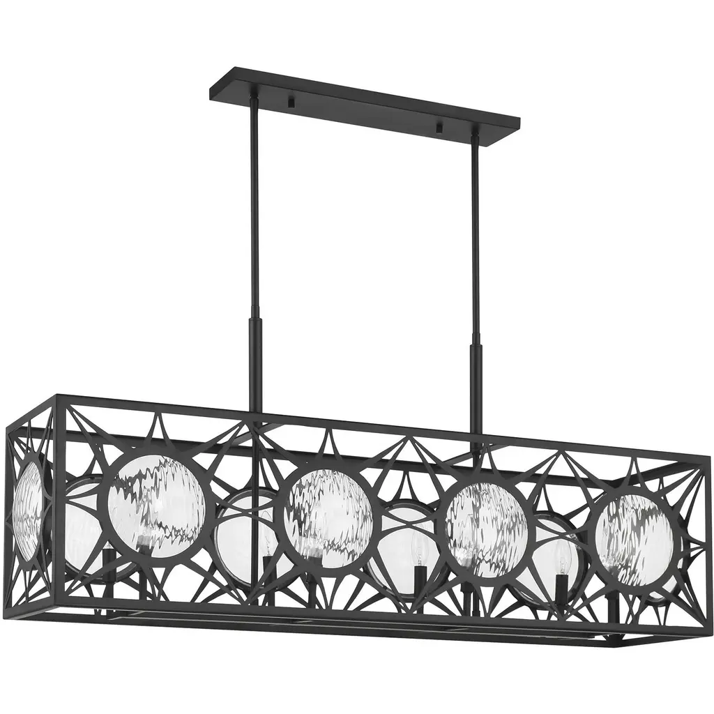Let your sense of style shine through with the beautiful Balfour 8-light linear chandelier from Savoy House Its rectangular structure wears a Matte Black finish and is decorated with eye-catching starburst patterns that hold circular panes of clear water glass. Balfour is 44" in length, 12.88" in width and has an adjustable height ranging from 19.75" to 73.75". It uses eight candelabra size bulbs of up to 60 watts per bulb. Bulbs not included. Comes with eight 12" downrods and two 6" downrods.