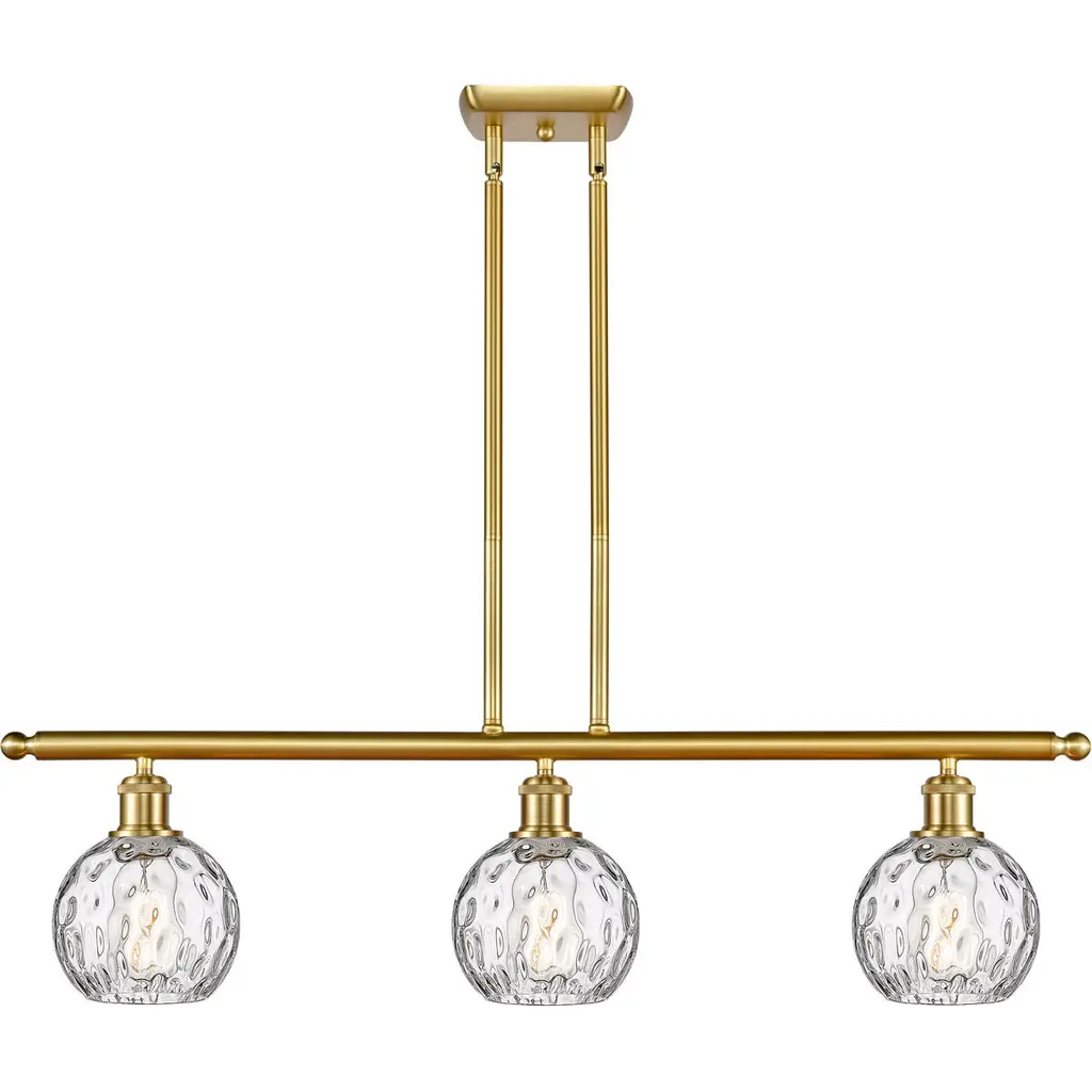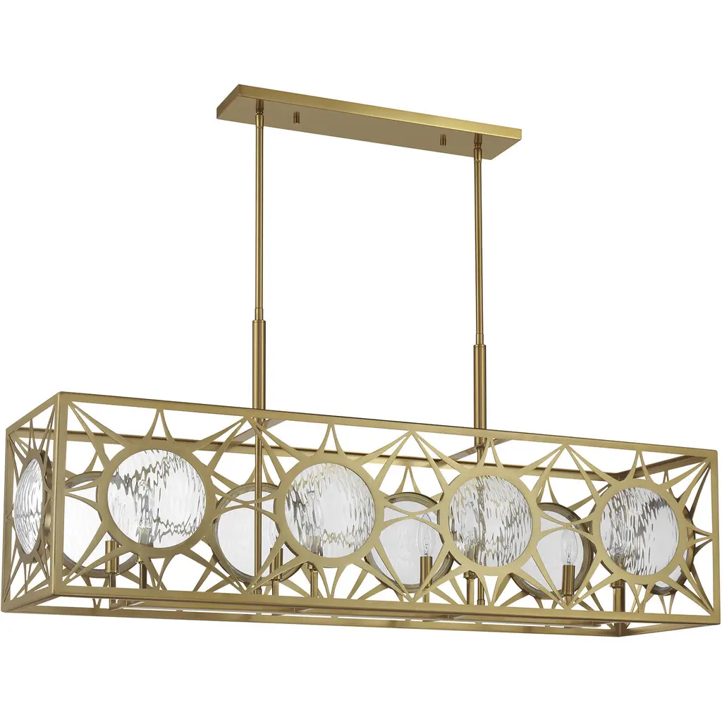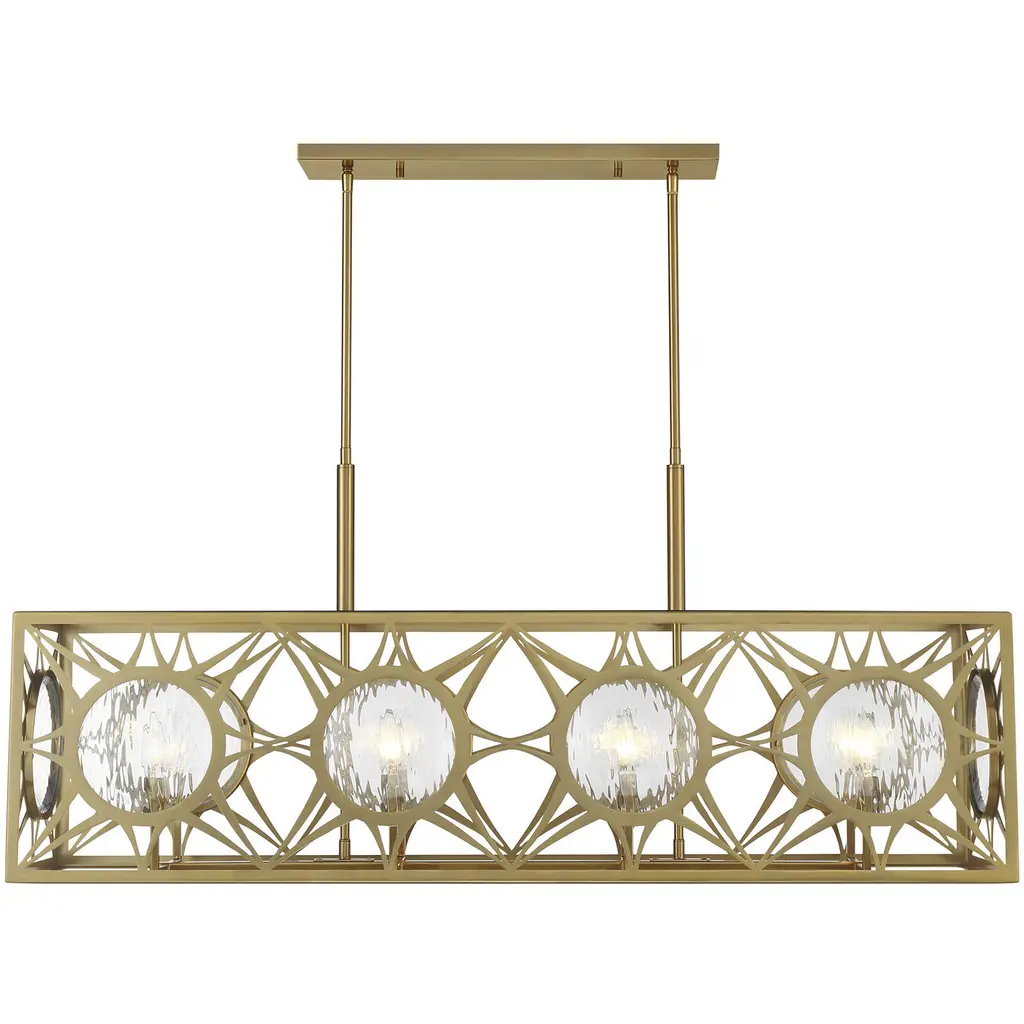 Let your sense of style shine through with the beautiful Balfour 8-light linear chandelier from Savoy House Its rectangular structure wears a Warm Brass finish and is decorated with eye-catching starburst patterns that hold circular panes of clear water glass. Balfour is 44" in length, 12.88" in width and has an adjustable height ranging from 19.75" to 73.75". It uses eight candelabra size bulbs of up to 60 watts per bulb. Bulbs not included. Comes with eight 12" downrods and two 6" downrods.