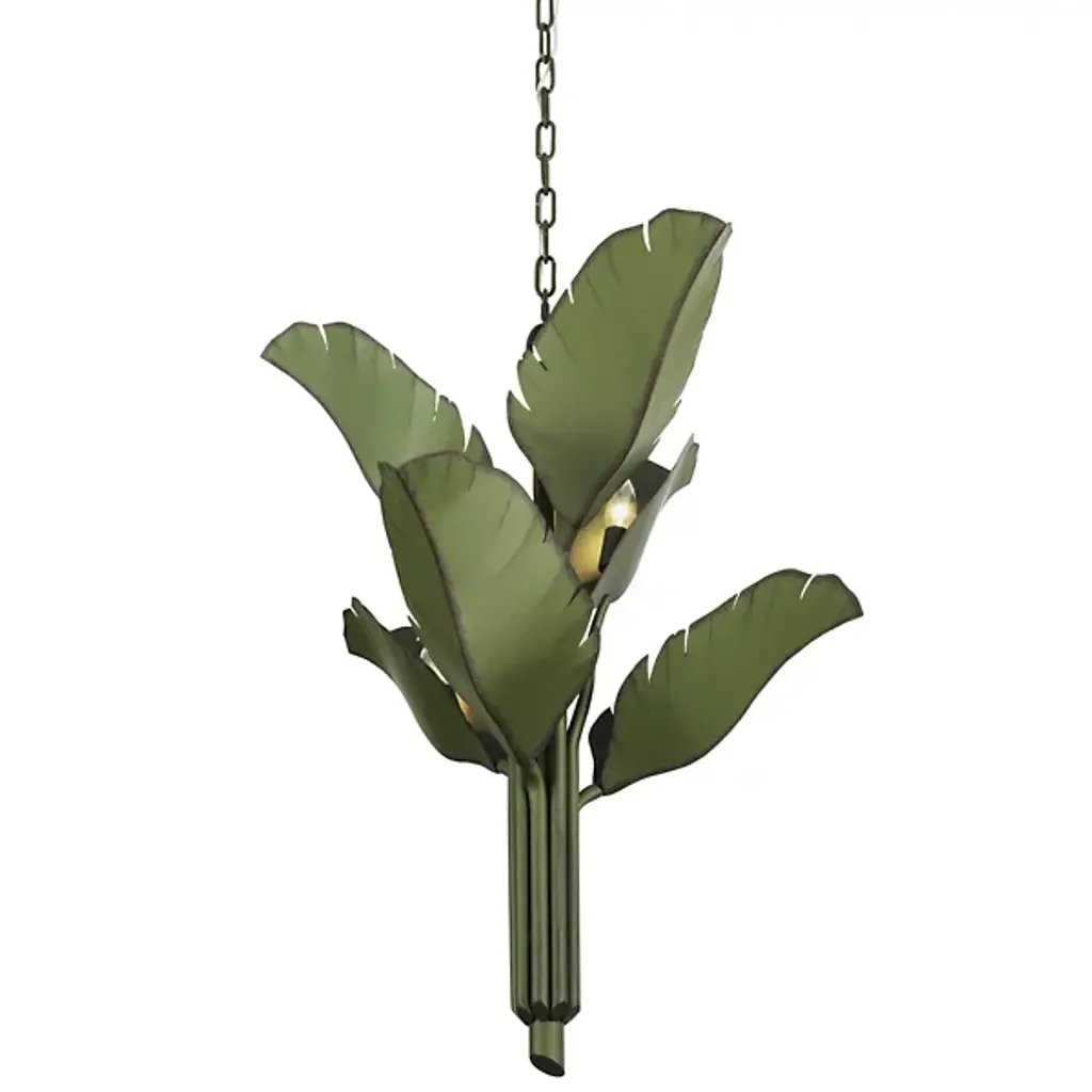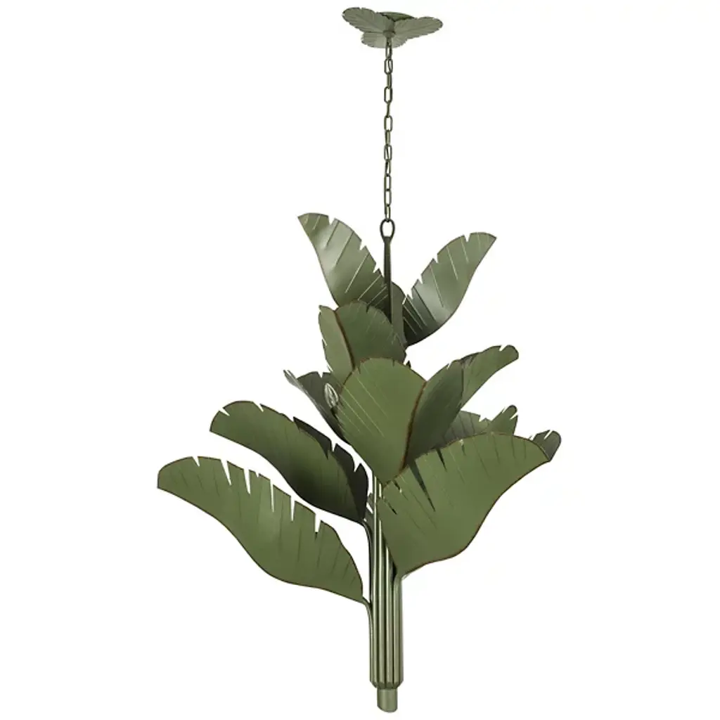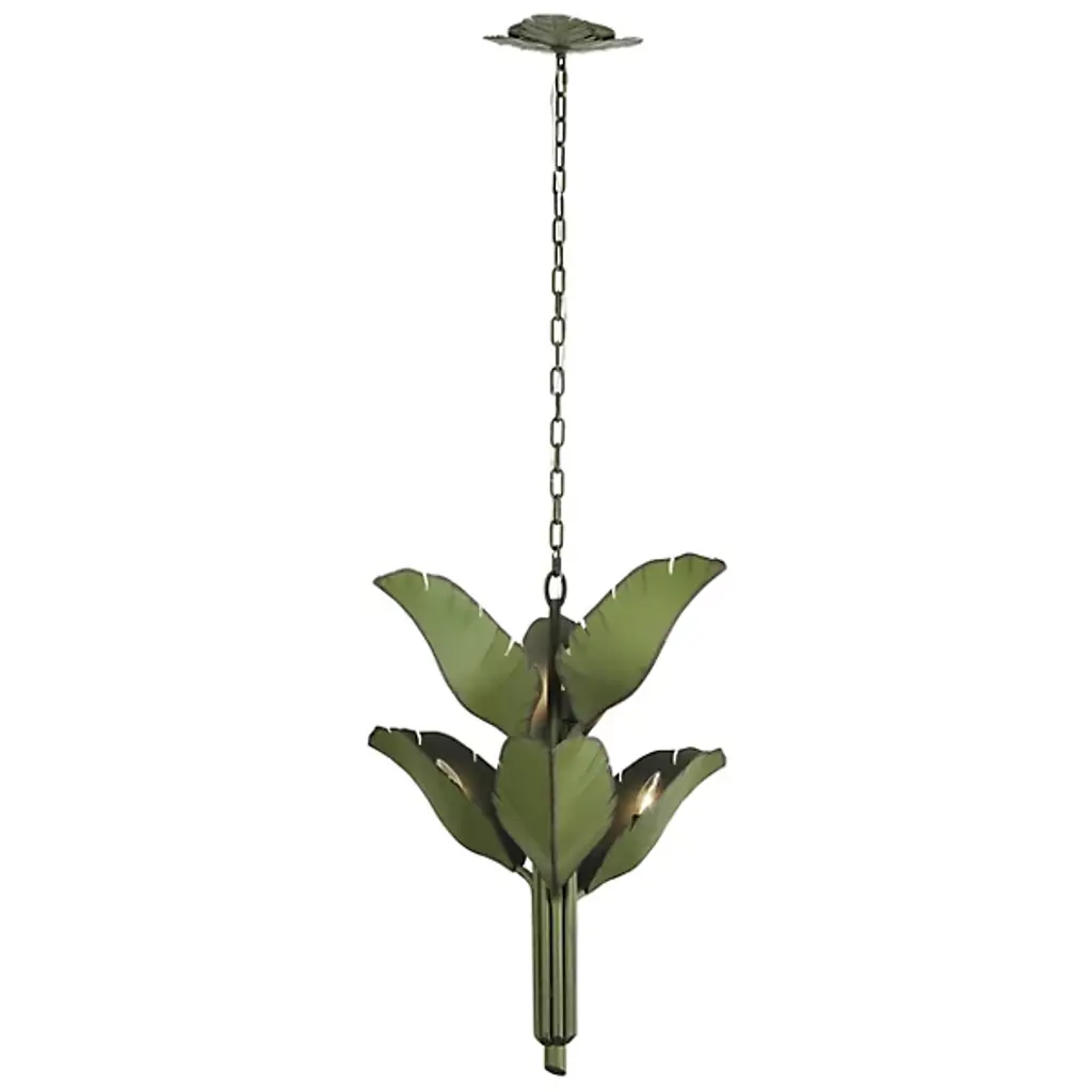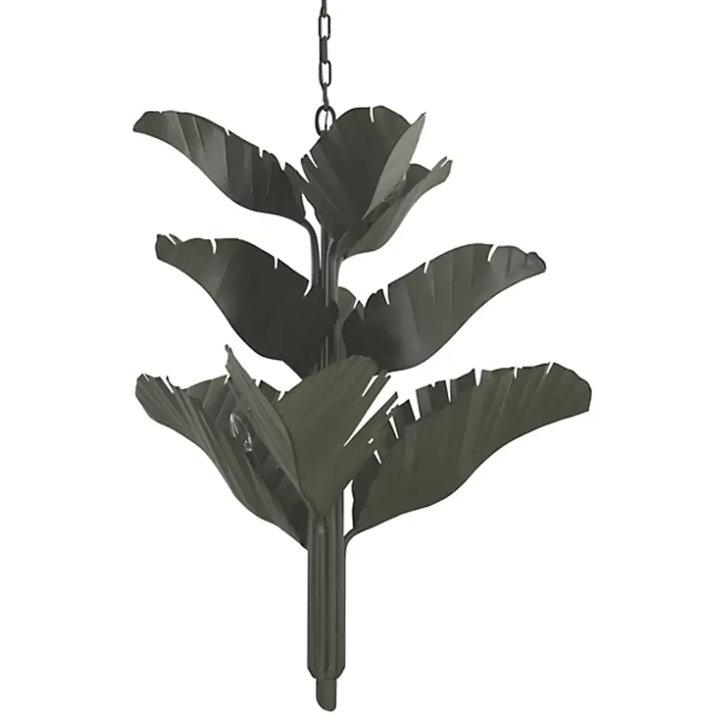 A tropical flourish for modern interiors. Originally designed for an oceanside South Beach hotel, the Banana Leaf Chandelier by Varaluz realistically depicts multiple banana leaves using hand-forged Steel. The steel makes the delicate-looking leaves exceptionally strong, and worthy of the design’s natural inspiration with more than 70% of that steel having been recycled. Functionally, the leaves camouflage the light sources within and disperse their light upward and outward in an atmospheric ambient glow, like sun coming through actual leaves. This chandelier is a great way to add an exotic touch to an entryway or over the table in a tall dining room.