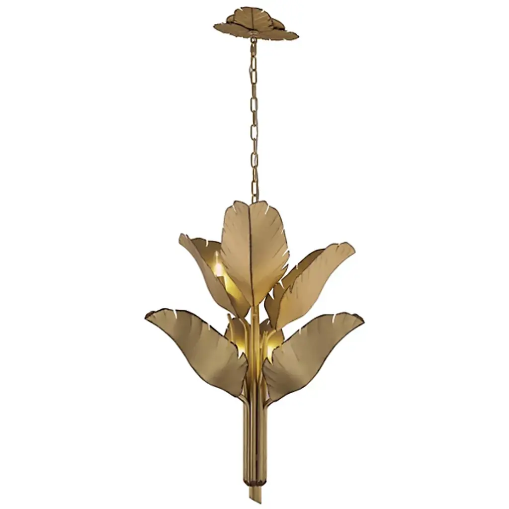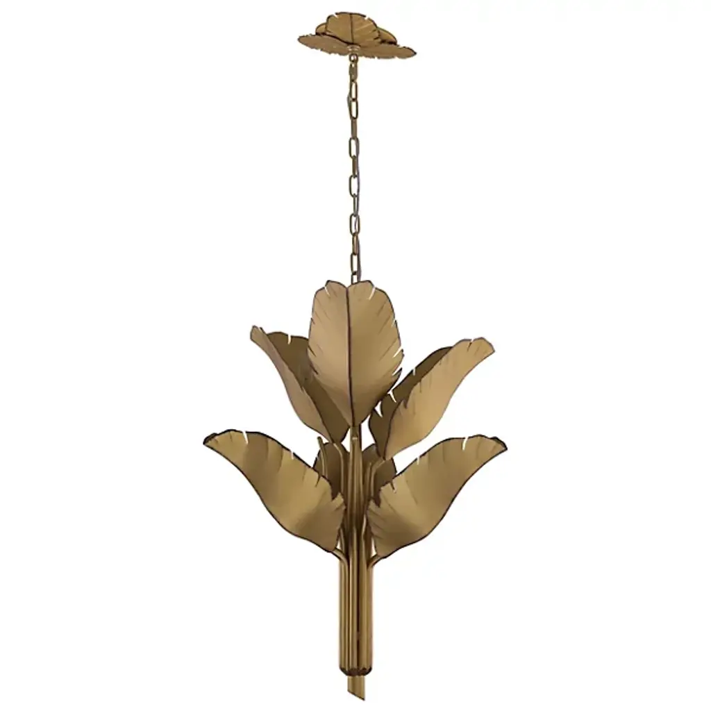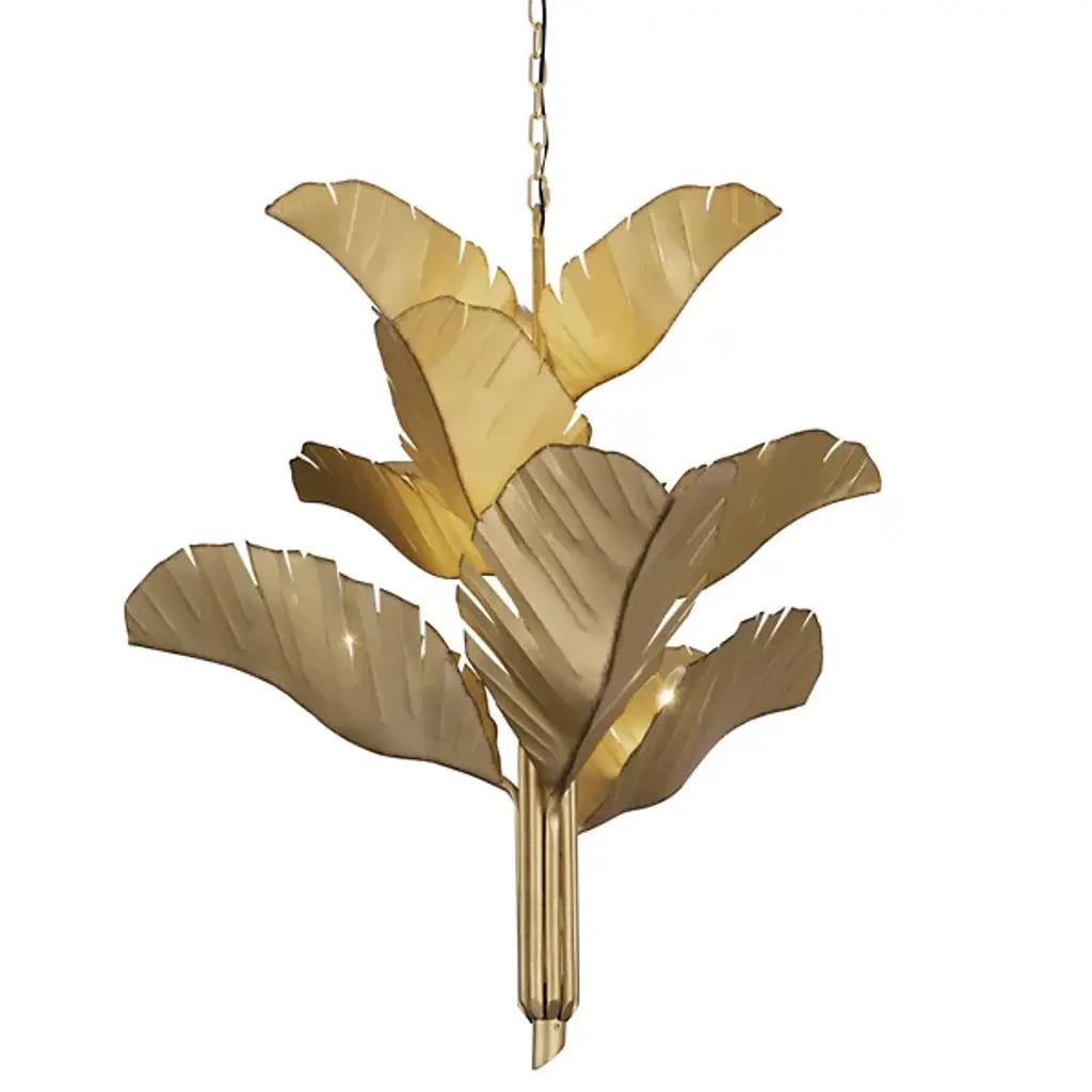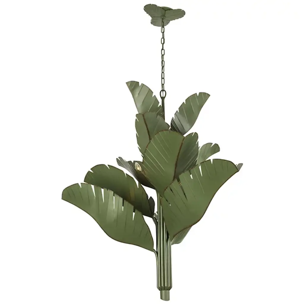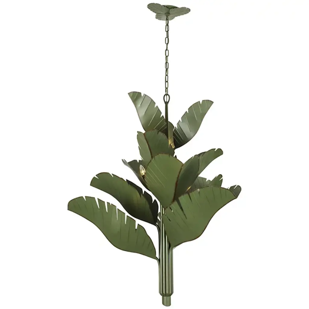 A tropical flourish for modern interiors. Originally designed for an oceanside South Beach hotel, the Banana Leaf Chandelier by Varaluz realistically depicts multiple banana leaves using hand-forged Steel. The steel makes the delicate-looking leaves exceptionally strong, and worthy of the design’s natural inspiration with more than 70% of that steel having been recycled. Functionally, the leaves camouflage the light sources within and disperse their light upward and outward in an atmospheric ambient glow, like sun coming through actual leaves. This chandelier is a great way to add an exotic touch to an entryway or over the table in a tall dining room.