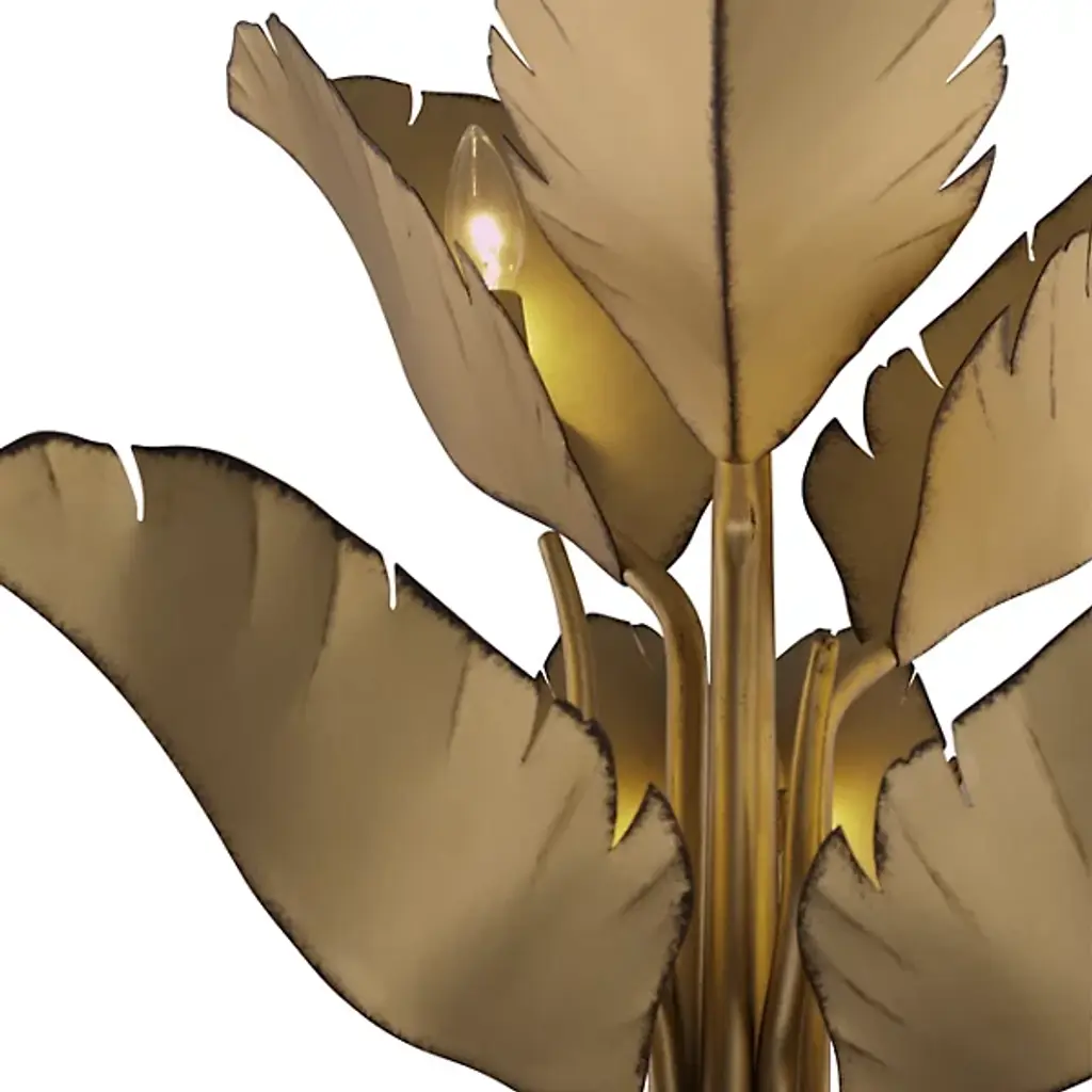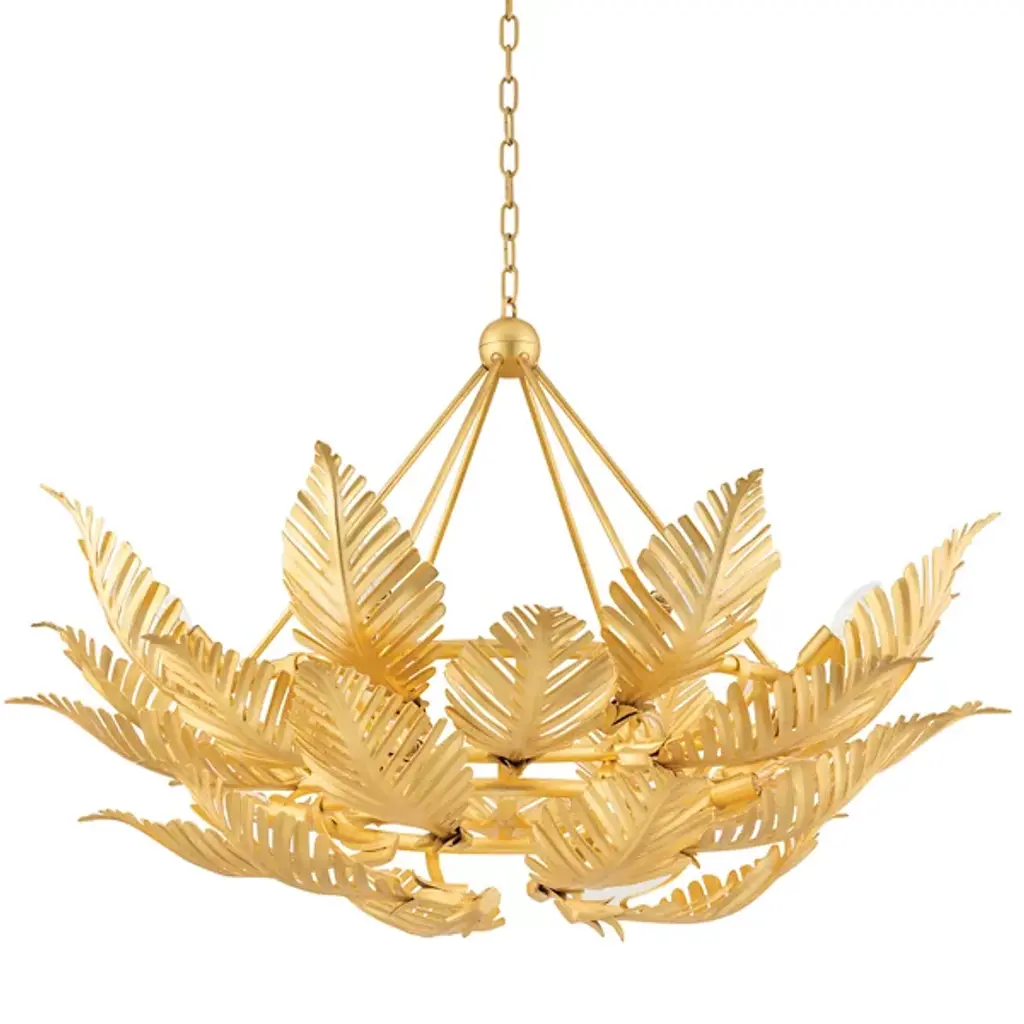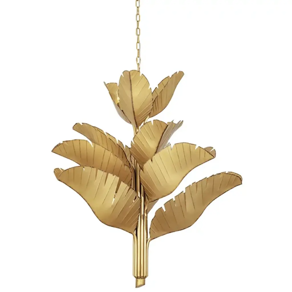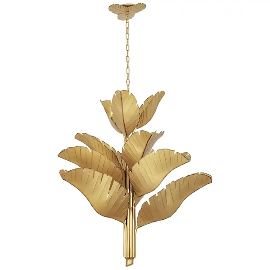 A tropical flourish for modern interiors. Originally designed for an oceanside South Beach hotel, the Banana Leaf Chandelier by Varaluz realistically depicts multiple banana leaves using hand-forged Steel. The steel makes the delicate-looking leaves exceptionally strong, and worthy of the design’s natural inspiration with more than 70% of that steel having been recycled. Functionally, the leaves camouflage the light sources within and disperse their light upward and outward in an atmospheric ambient glow, like sun coming through actual leaves. This chandelier is a great way to add an exotic touch to an entryway or over the table in a tall dining room.