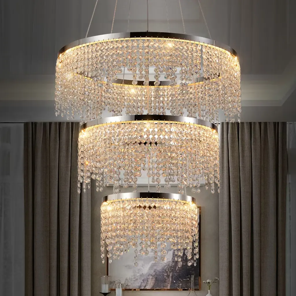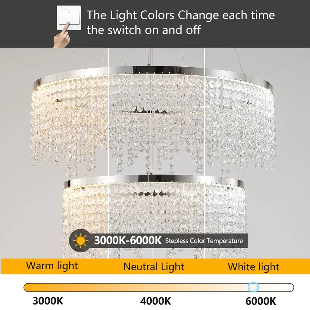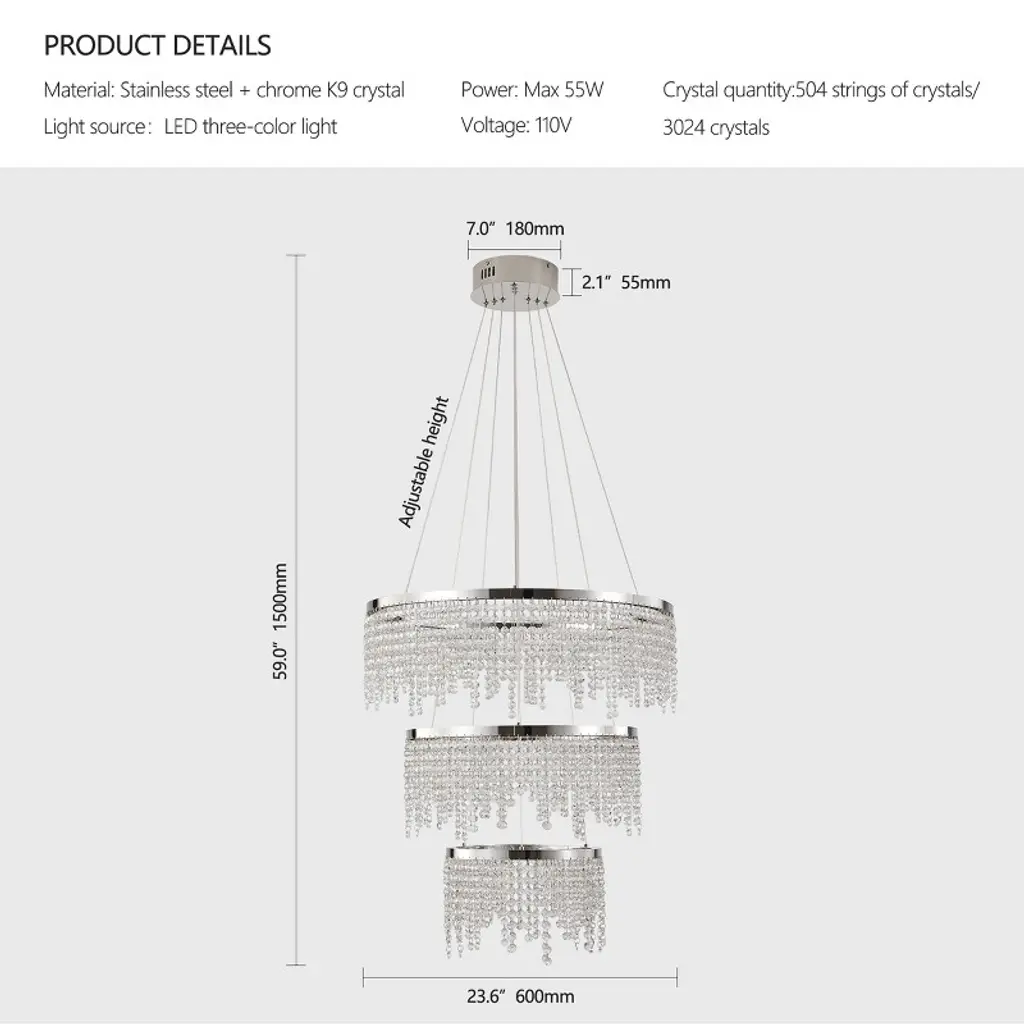 Elevate your space with this stunning 24-inch Crystal Chandelier that combines modern sophistication with functional lighting technology. Designed for discerning homeowners, this fixture features premium K9 crystals arranged on a polished stainless steel frame, creating dazzling light patterns that enhance any interior. The adjustable color temperature allows you to set the perfect mood, from warm intimate glow to bright daylight illumination.Technical Specifications:Dimensions: 24-inch diameter with adjustable height (up to 59")Materials: Stainless steel frame with K9 clear crystalsFinish: Polished chrome with transparent crystal elementsLight Source: Integrated 55W LED (5575 lumens)Color Temperature: Adjustable 3000K/4000K/6000KColor Rendering: 80 CRIPower: 110V hardwiredControl: On/off switch (non-dimmable)Installation: Ceiling mountRecommended Applications: Dining rooms, foyers, living rooms, hotel lobbies, upscale retail spacesDesign Notes:The chandelier's polished chrome finish complements both modern and traditional decors, while the precisely cut K9 crystals ensure maximum sparkle and light diffusion. Ideal for rooms with 8-12 foot ceilings, this fixture makes a dramatic statement while providing practical, energy-efficient illumination.