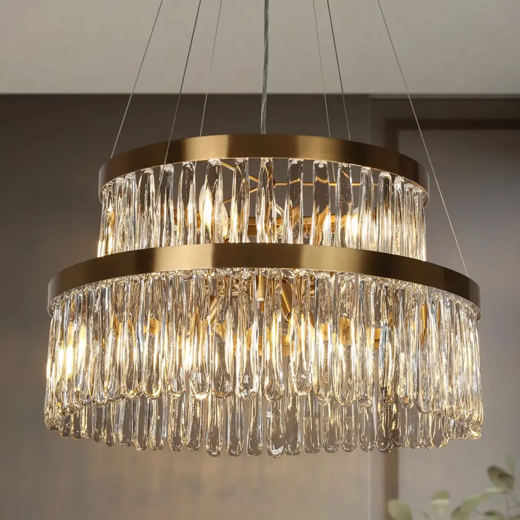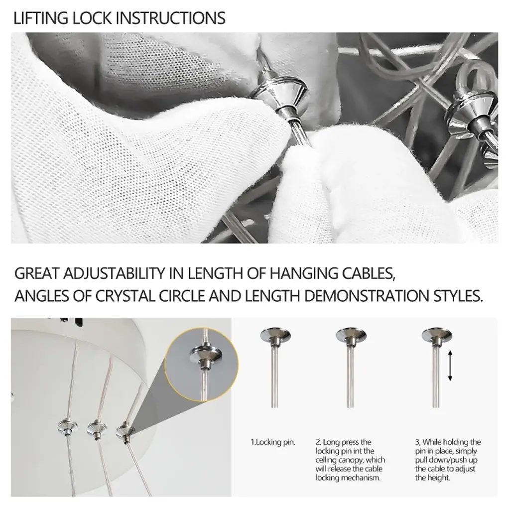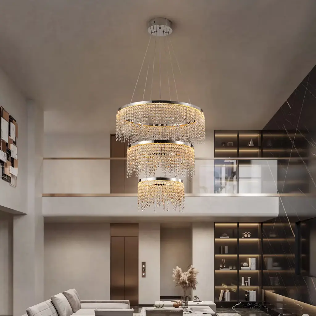 Elevate your space with this stunning 24-inch Crystal Chandelier that combines modern sophistication with functional lighting technology. Designed for discerning homeowners, this fixture features premium K9 crystals arranged on a polished stainless steel frame, creating dazzling light patterns that enhance any interior. The adjustable color temperature allows you to set the perfect mood, from warm intimate glow to bright daylight illumination.Technical Specifications:Dimensions: 24-inch diameter with adjustable height (up to 59")Materials: Stainless steel frame with K9 clear crystalsFinish: Polished chrome with transparent crystal elementsLight Source: Integrated 55W LED (5575 lumens)Color Temperature: Adjustable 3000K/4000K/6000KColor Rendering: 80 CRIPower: 110V hardwiredControl: On/off switch (non-dimmable)Installation: Ceiling mountRecommended Applications: Dining rooms, foyers, living rooms, hotel lobbies, upscale retail spacesDesign Notes:The chandelier's polished chrome finish complements both modern and traditional decors, while the precisely cut K9 crystals ensure maximum sparkle and light diffusion. Ideal for rooms with 8-12 foot ceilings, this fixture makes a dramatic statement while providing practical, energy-efficient illumination.