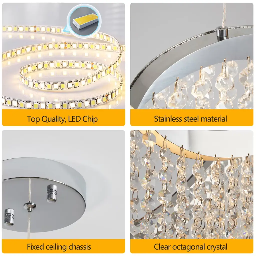 Material: Stainless steel + CrystalColor: Chrome + TransparentLight Source Type: LEDBrightness Adjustment: Not Supporting DimmingInstallation Mode: CeilingPower Supply Mode: Hard-wiredSupport Control: On-Off ControlColor Temperature: 3000K-4000K-6000KColor Rendering Index: 80Wattage: 32WVoltage: 110V