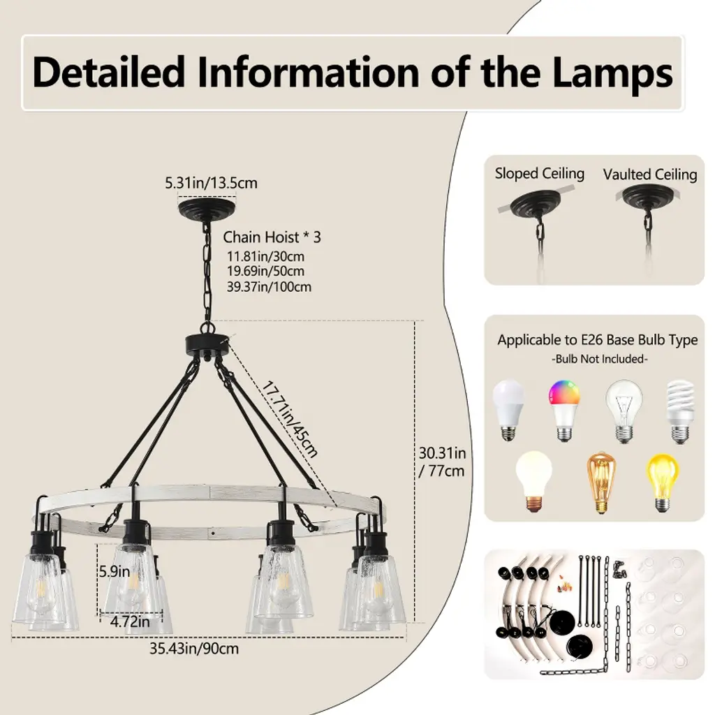 Illuminate Your Space with Rustic Grandeur: The Seeded Glass Wagon Wheel ChandelierElevate your home's ambiance with the breathtaking rustic wagon wheel chandelier, a masterful blend of industrial strength and vintage allure.Imagine the captivating play of light: dozens of meticulously arranged seeded glass shades, each one intricately textured to refract and scatter illumination in a dazzling display of sparkle, suspended from a strikingly authentic metal wagon wheel frame.This isn't just a light fixture; it's a bold statement piece, instantly infusing your dining room, kitchen island, living room, porch, or entryway – channeling rustic farmhouse warmth, rugged industrial charm, or timeless vintage appeal.