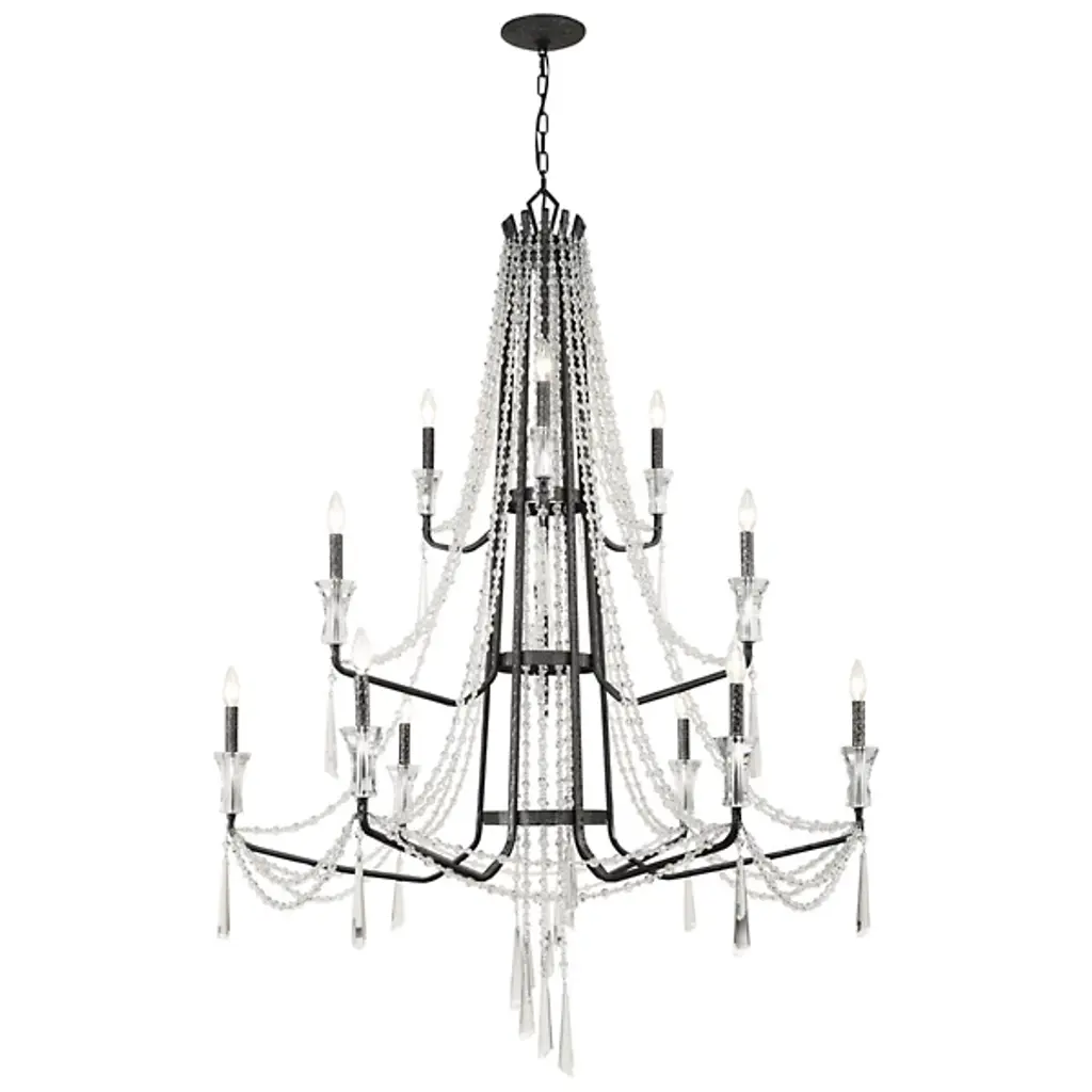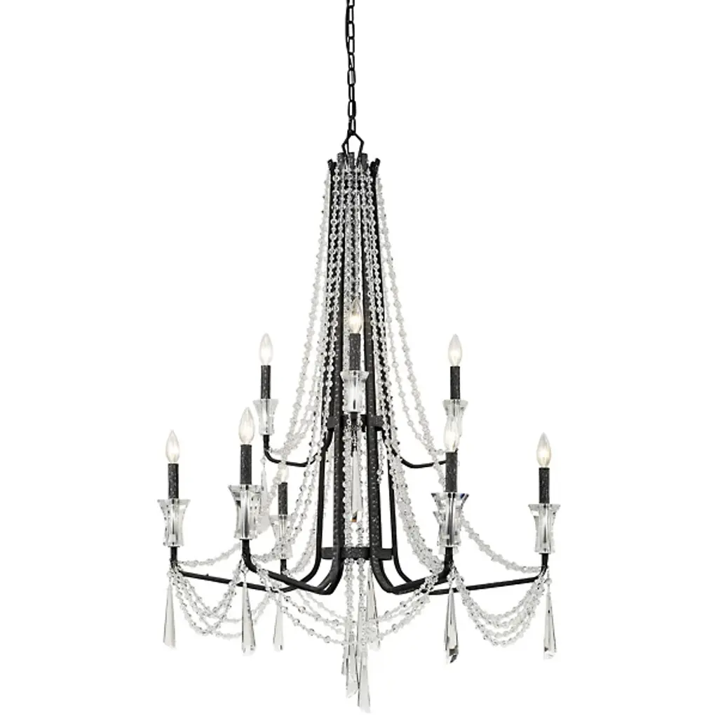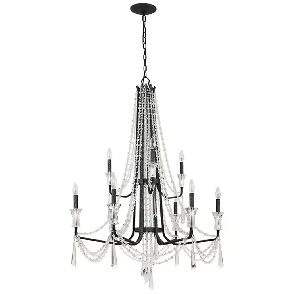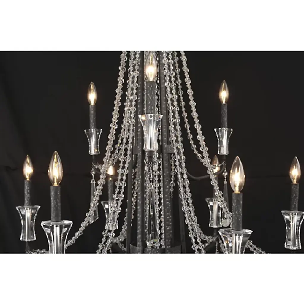 Sparkling Spanish design, on a grand scale. The Barcelona Large Chandelier by Varaluz is the ultimate in sparkling decadence and Spanish rusticity. It features a multi-tier frame made out of hand-forged and hand-textured recycled Steel. It’s an impressive structure that’s made infinitely more so with the generous bedecking of high-quality clear Optic Crystal. Numerous strands drape each tier, and a solid crystal bobeche adorns each exposed bulb holder. Turn the fixture on, and the entire piece dazzles with sparkling shards of ambient light. In a large dining room, living room, or spiral stairwell, this piece is a stunner.