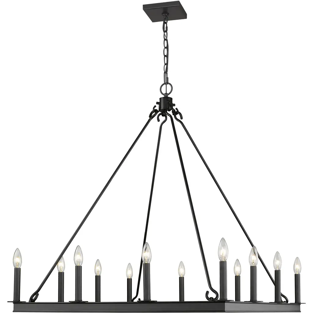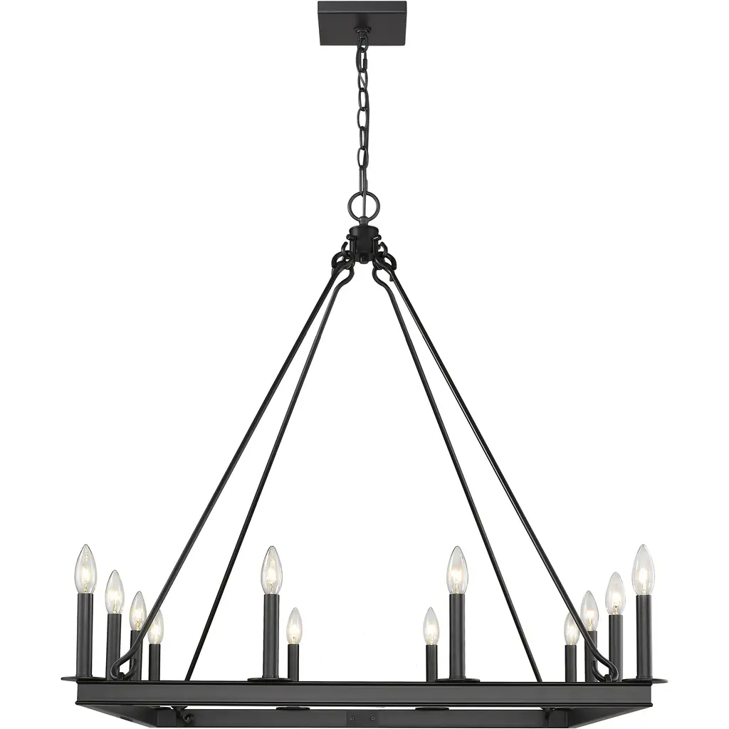 Elevate the elegance of your home lighting with this majestic twelve-light chandelier. It features a handsome matte black finish with the candle-inspired lights in a bold square design. It's the chandelier you've been looking for to light up your dining room, foyer, or kitchen.