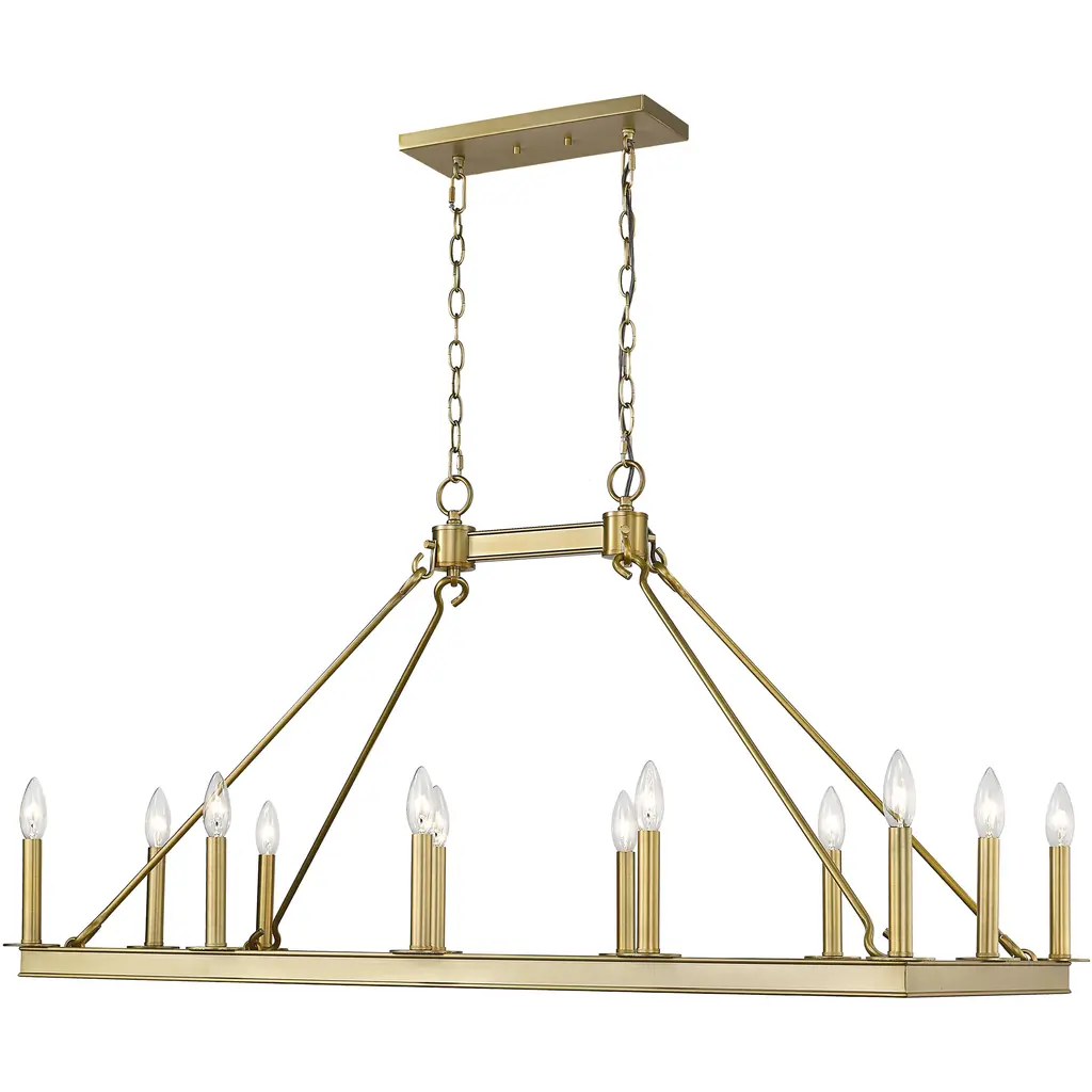 This majestic twelve-light island/billiard light makes an elegant addition to your home lighting collection. It's crafted in a gorgeous olde brass finish and features the candle-inspired lights in a vibrant rectangular design. It's the ideal light for the dining room, foyer, kitchen, or entertainment room.