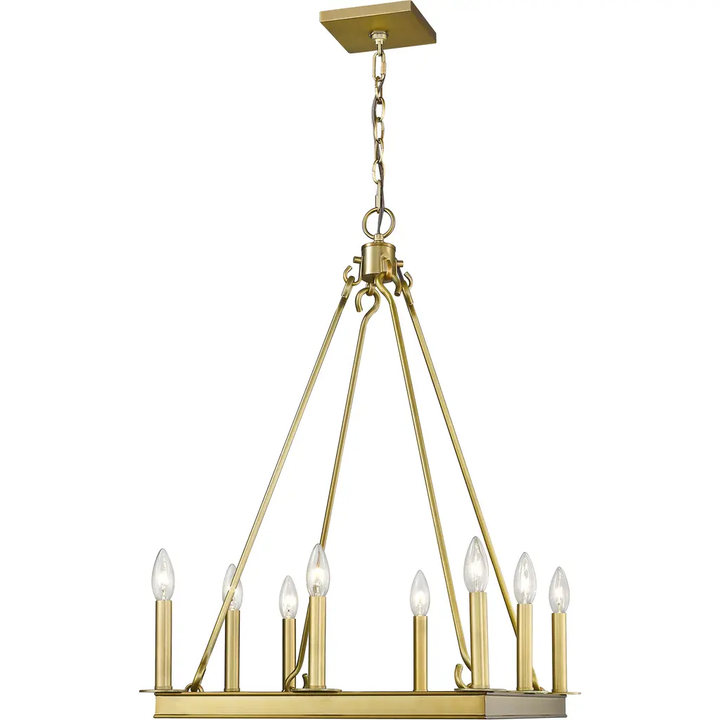 This stylish eight-light chandelier is a delightful addition to your home lighting. It's fashioned in a lustrous olde brass finish with the candle-inspired lights in a bold square design. This chandelier is designed to be a showpiece in your dining room, foyer, or kitchen.