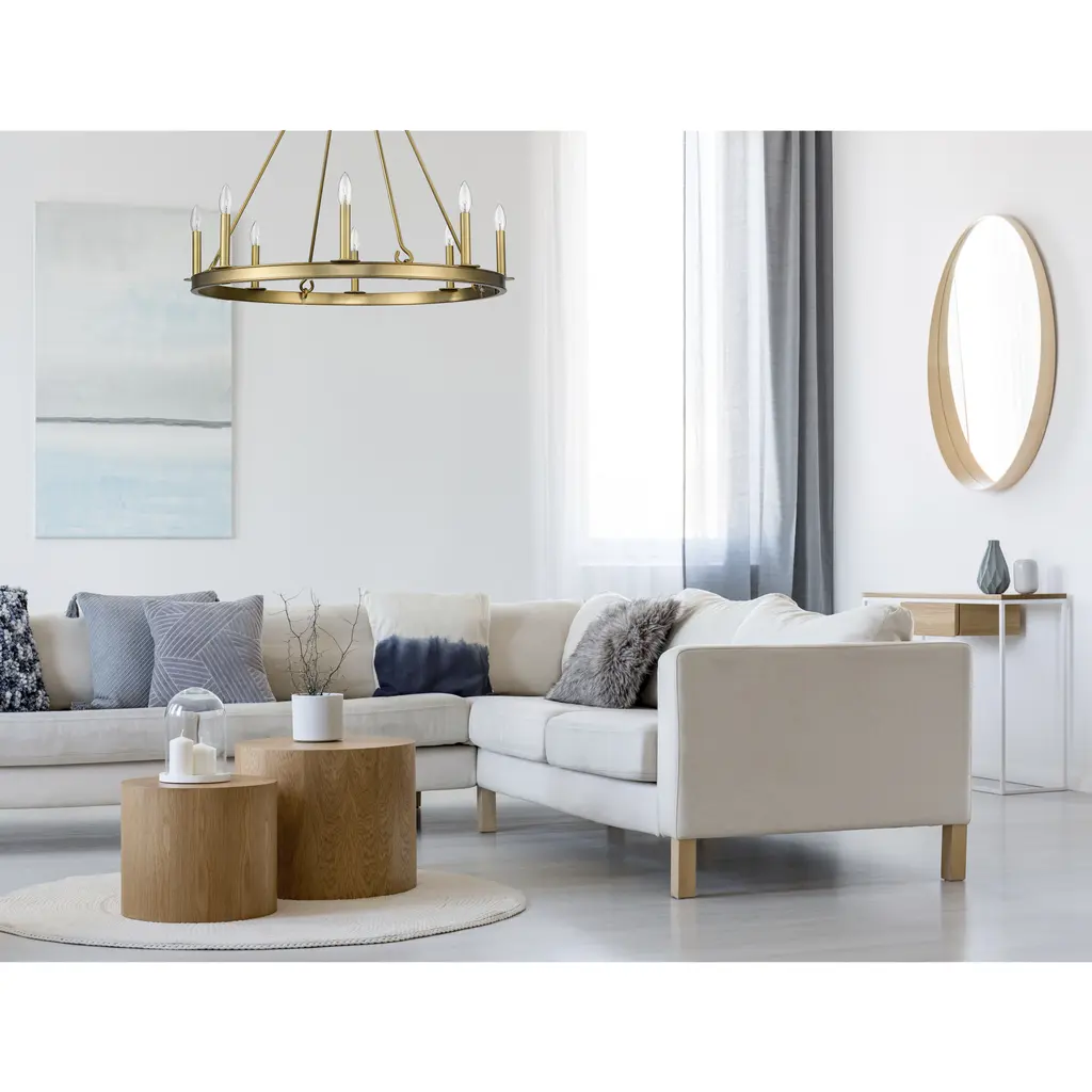 Light up your home both stylishly and literally with the addition of this lovely eight-light chandelier. It's crafted in a lustrous olde brass finish and features the candle-inspired lights in a charming round design. The chandelier is perfectly suited for the breakfast nook, foyer, kitchen, or entertainment room.