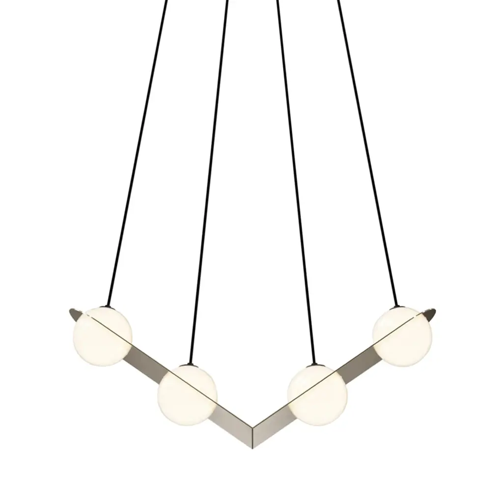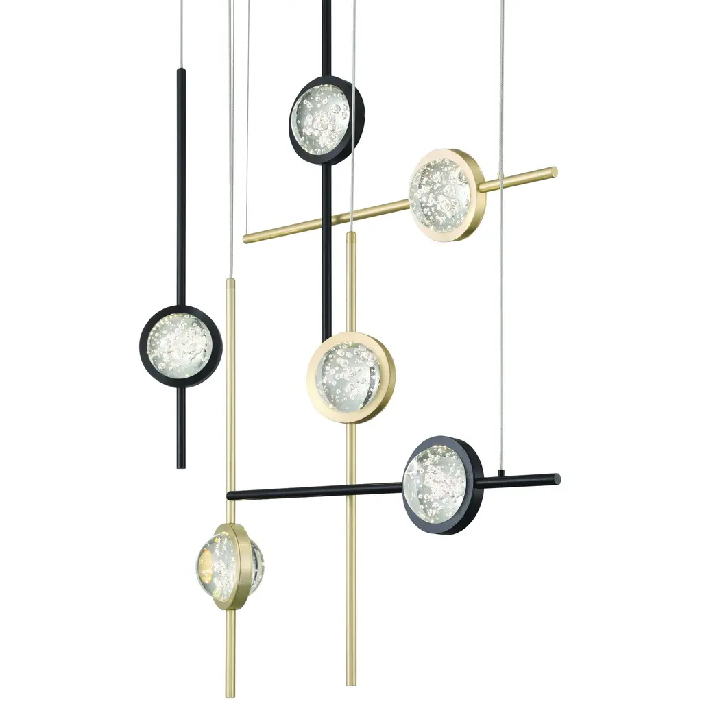 Various sized anodized rods suspend vertically in black or gold finishes. Each rod is furnished with a clear seeded glass orb that perfectly sits within an anodized ring.