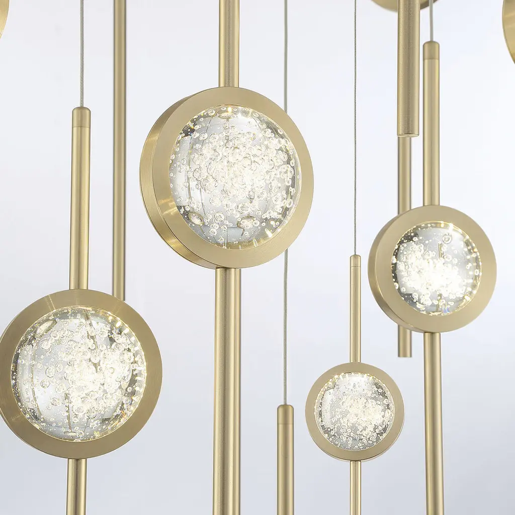 Various sized anodized rods suspend vertically in black or gold finishes. Each rod is furnished with a clear seeded glass orb that perfectly sits within an anodized ring.
