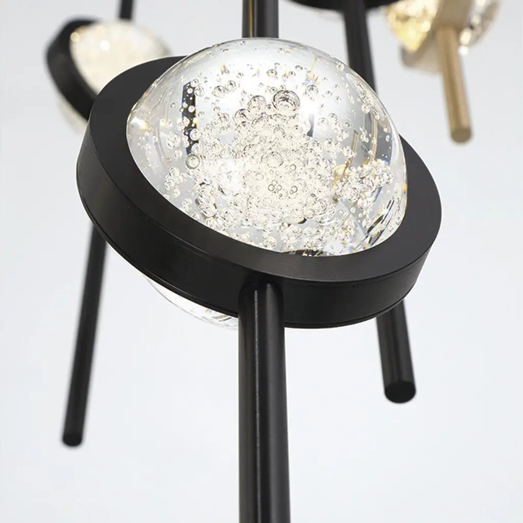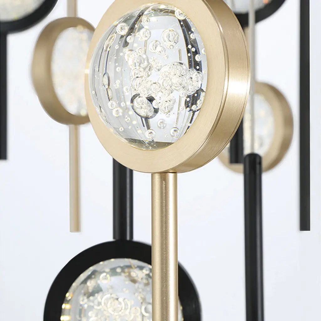Various sized anodized rods suspend vertically in black or gold finishes. Each rod is furnished with a clear seeded glass orb that perfectly sits within an anodized ring.
