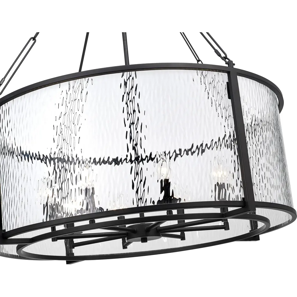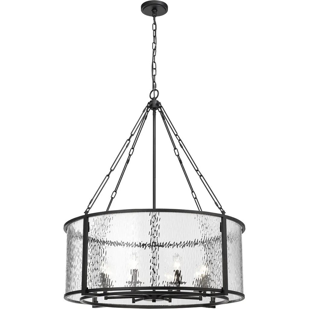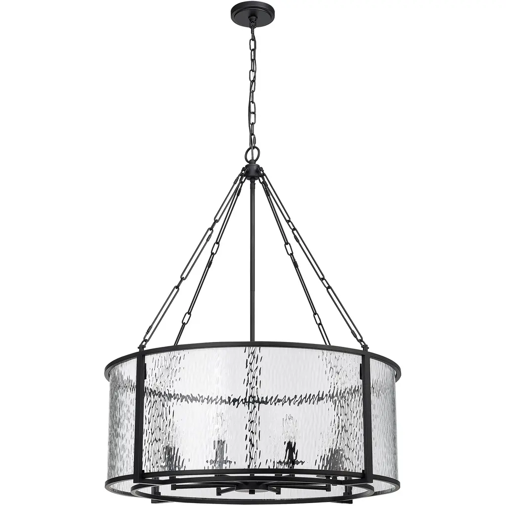 A grand scale and tempting circular silhouette begin a journey to dramatic design elements as this striking light fixture becomes a mainstay in dining spaces, foyers, and living areas. This eight-light pendant from the Barrington collection is styled around an enticing energy and an industrial motif with a round cage made of matte black finish steel framing romantic clear waterglass that distorts a view of candelabra bulbs creating a castle-inspired look. Removable chain links and rod allow for a reduction in fixture height to 27.75" if desired.