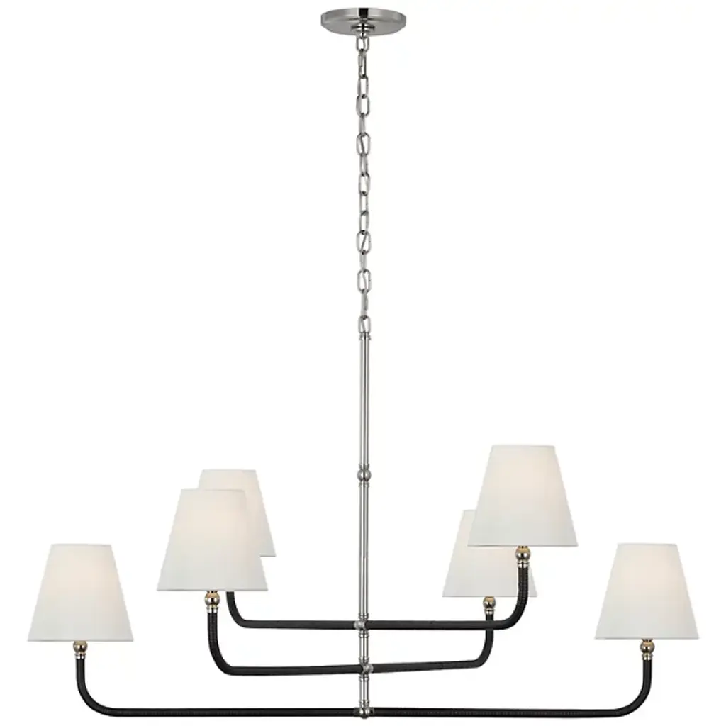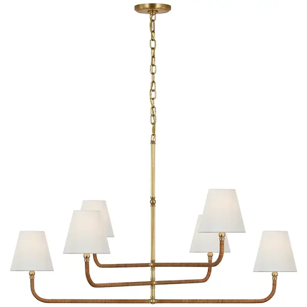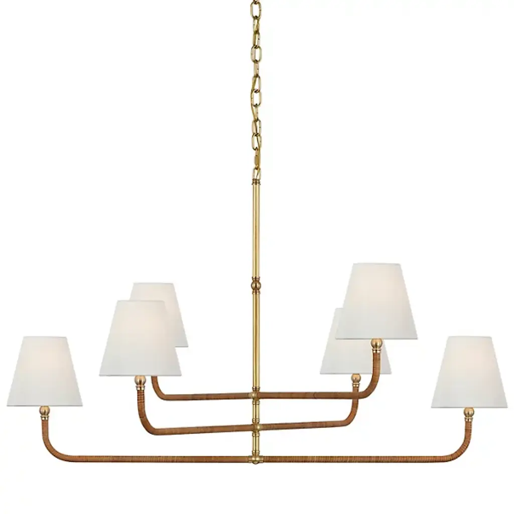 The Basden Three Tier Chandelier from Visual Comfort Signature delivers a transitional silhouette enveloped in a warm aura. Designed by Chapman & Myers, this elegant chandelier is composed of steel and brass. Small globes on the chandelier's downrod and arms add tasteful accenting. Rattan is wrapped around Basden's three tiers for a natural, textured feel. Tapered linen shades house LED lights to minimize glare as they produce a multi-directional glow.