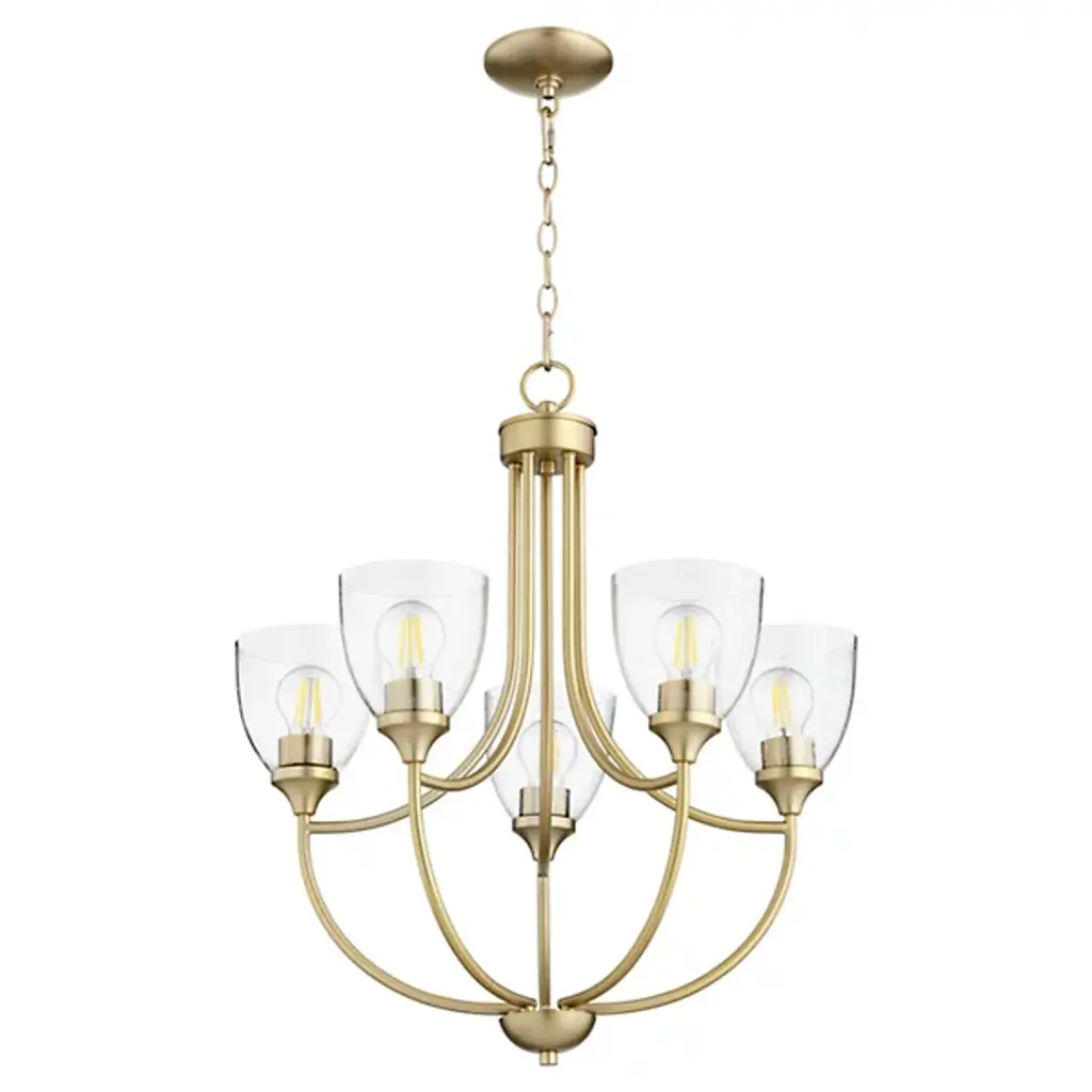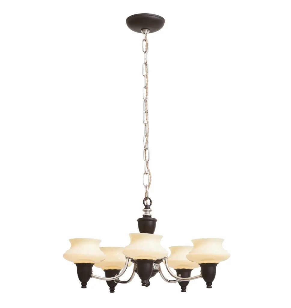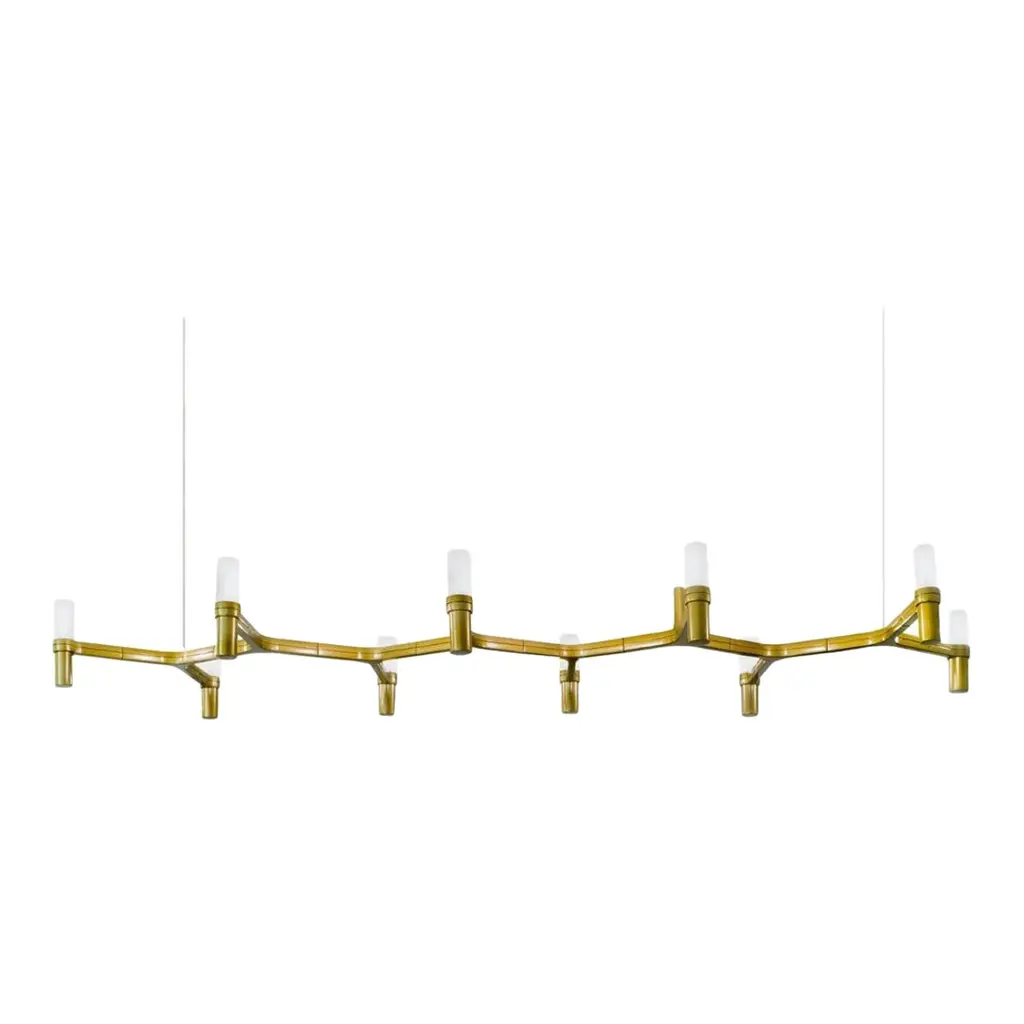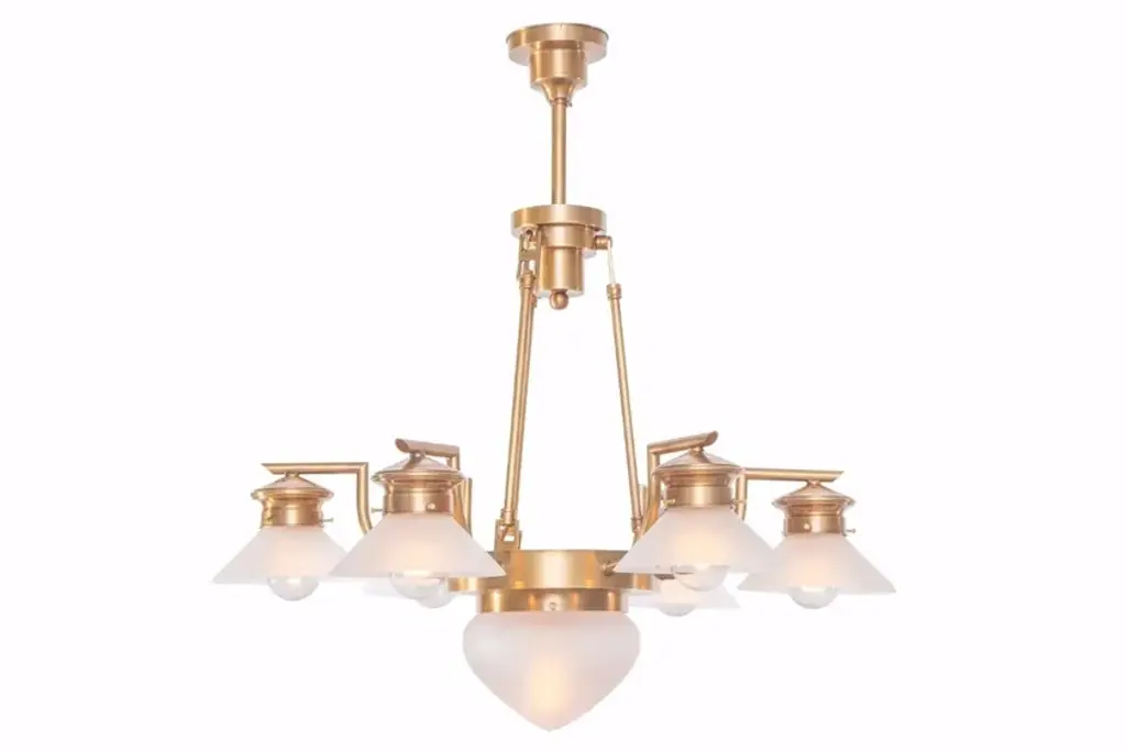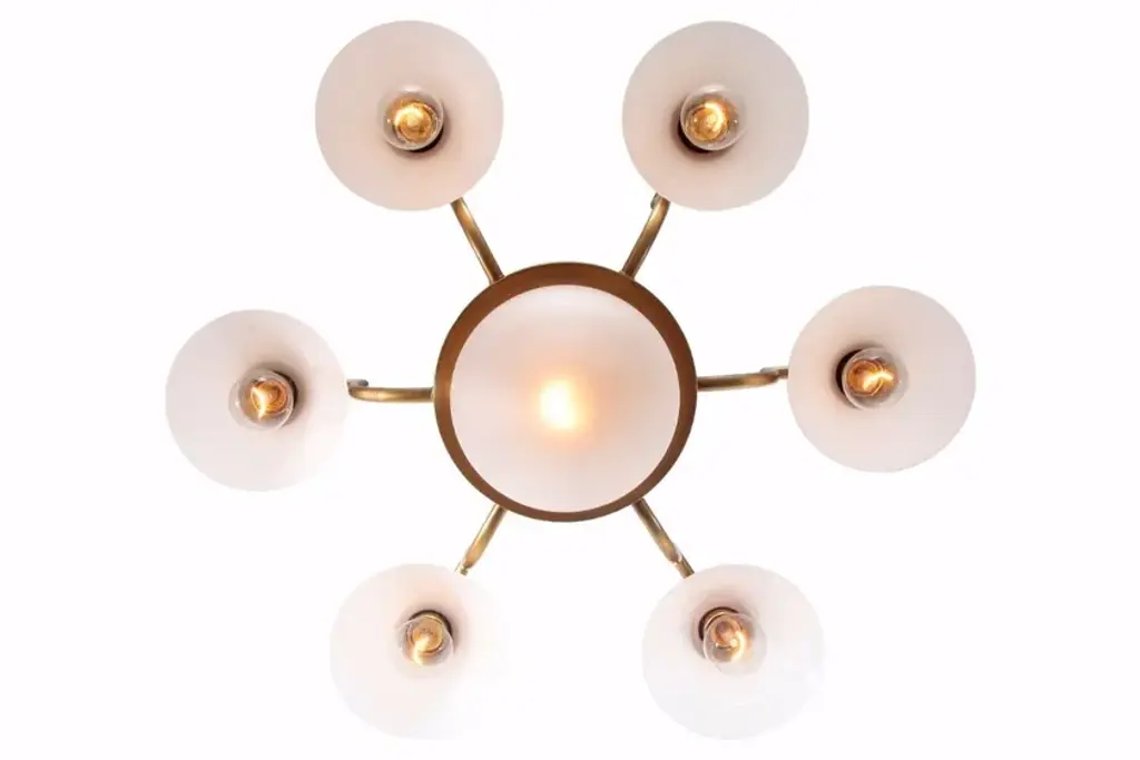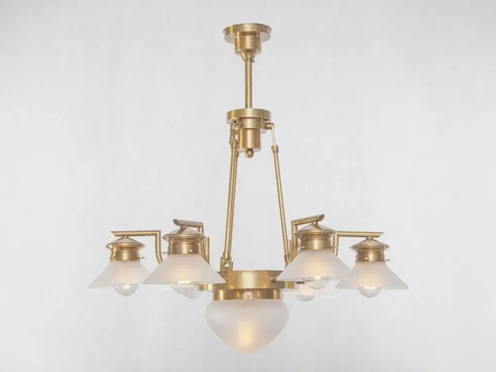 Basel 6 is a 6-arm chandelier made of brass available in different finishes.Finishes: Antique, Shiny brass, Matt brass, Shiny nickel, Matt nickelCapacity: 7x75 W E27This little collection is simplicity in its purest Deco form. Due to their little size, the lamps of this collection are particularly suitable for lighting an average living space. The six armed chandelier comes with matching wall lights and a pendant.