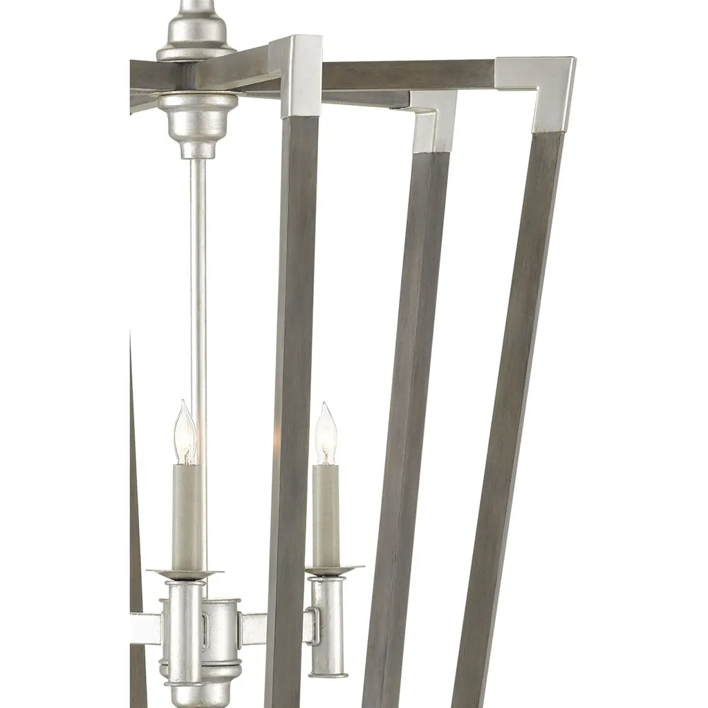 The Arts & Crafts movement inspired the design of the Bastian Small Gray Chandelier, which is made of wrought iron and wood in chateau gray and contemporary silver leaf finishes. The crisp feel of the silver metal clasping the spokes of wood brings extra sophistication to this lantern-shaped chandelier. There are a number of designs in this family of fixtures.
