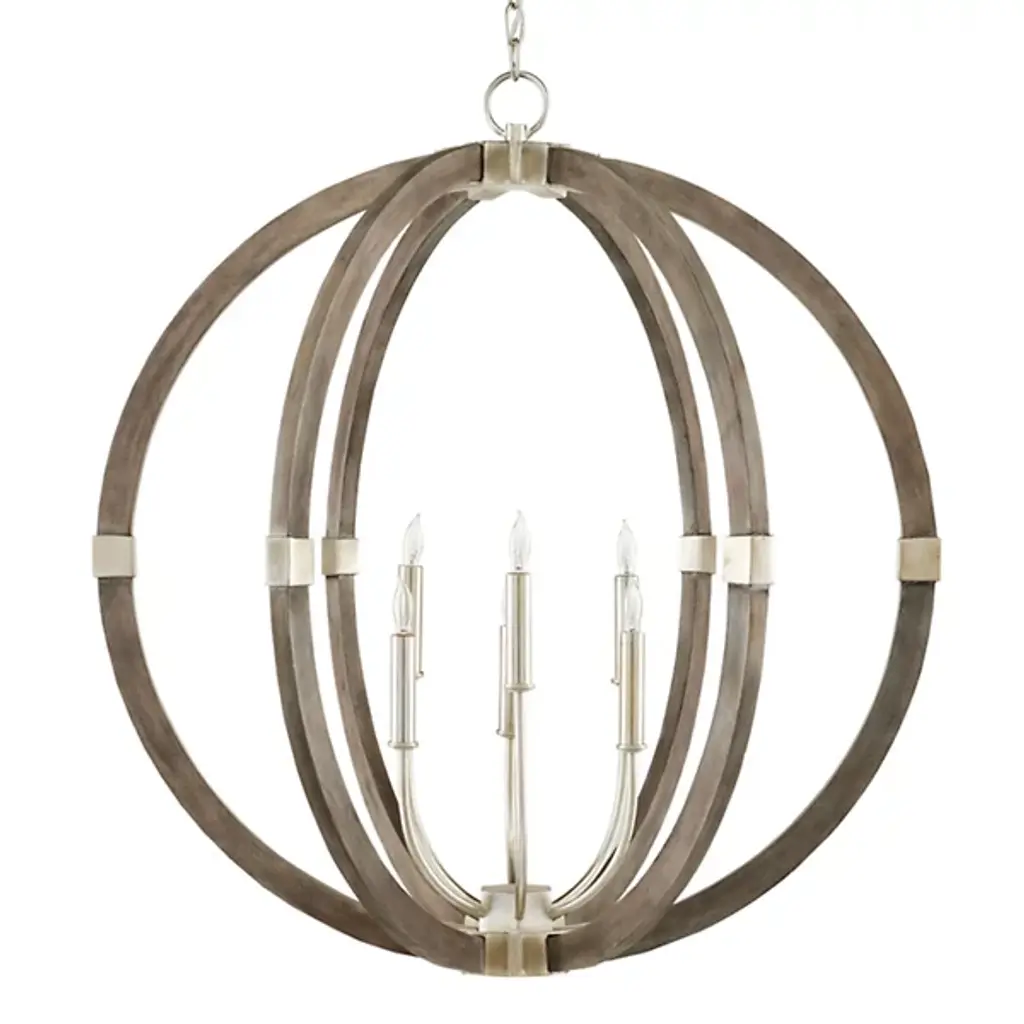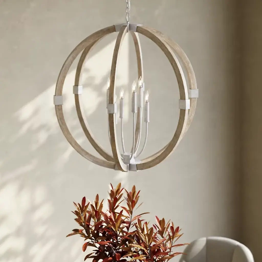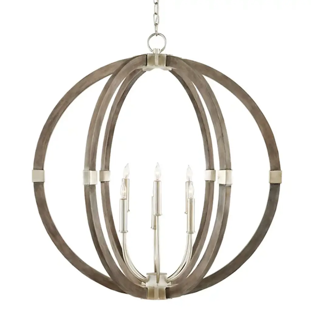 Enhance inside ceilings with the open, intricate appeal of the Bastian Orb Chandelier from Currey & Company. This appealing orb frame of wood with metal joints is suspended from a circular canopy via a chain, surrounding a slender, curving candelabra that emerges from the lower inner surface of the frame, blazing out with a warm, wide-reaching brilliance. The arcing ribs add a shadowy note of accompaniment to the otherwise unrestricted light, creating a refined and enduring presence.