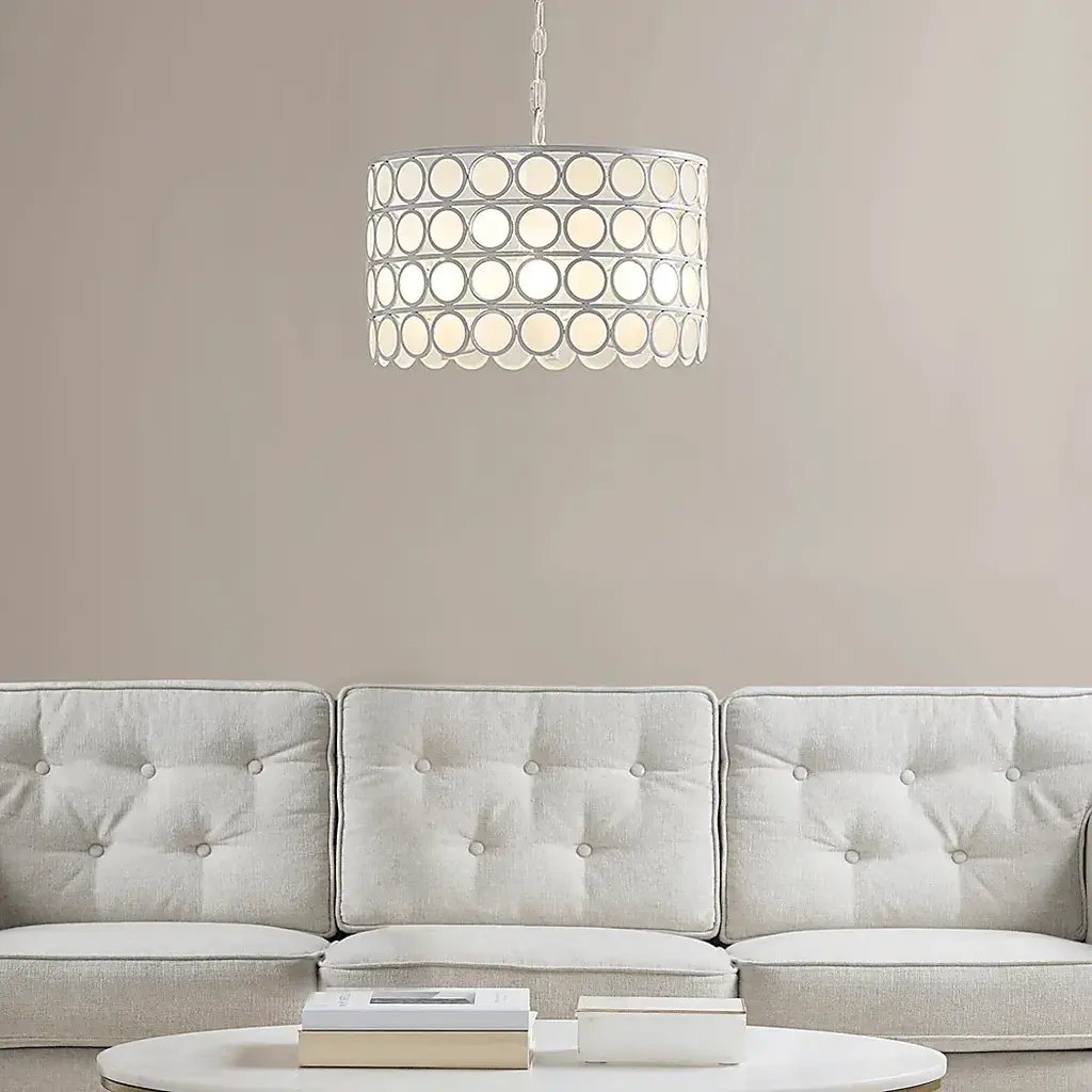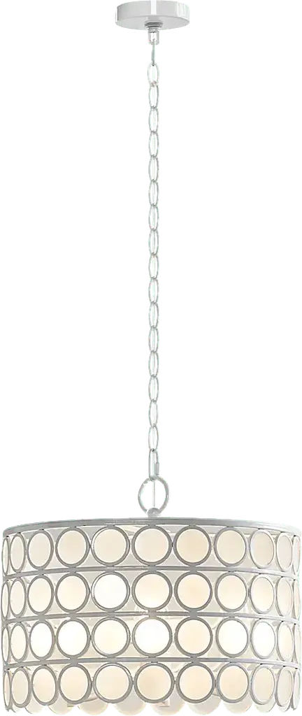 Illuminate your dining space or kitchen with the elegance of the Bates Edge White Chandelier. Flaunting a white metal finish, this chandelier features a drum-shaped shade with white circle designs to create a unique mid-century look. The matching ceiling mount and chain complement the vintage design, while providing plenty of light to your space. Professional installation by an electrician is recommended.