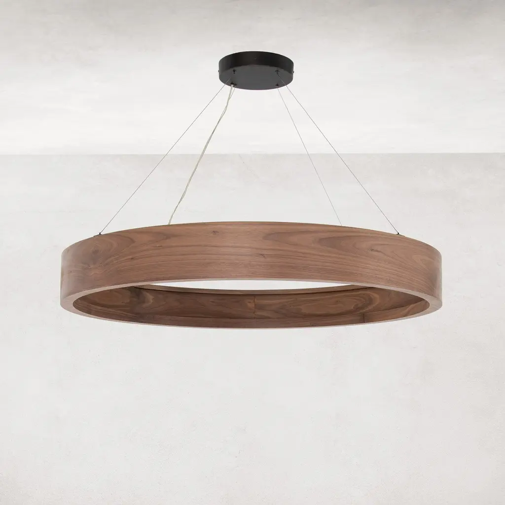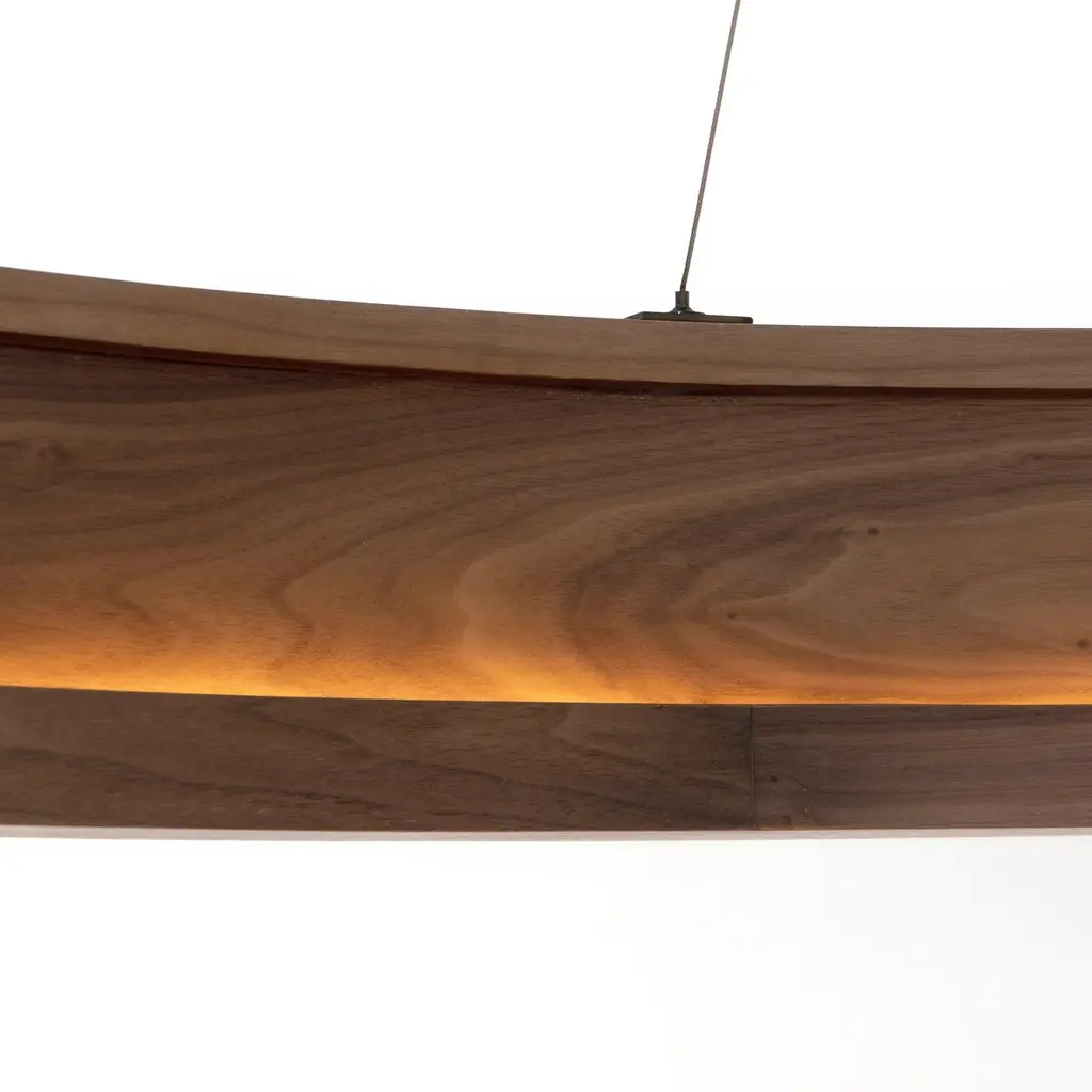 Light up the room with a beautifully rounded chandelier of dark-finished walnut veneer with bronzed stainless steel suspension. Emitting a soft, ambient glow, dimmable LED lighting strip (included) stays concealed for sleekness. Translucent cord for flat ceiling mounting. Maximum hanging length 79"; minimum hanging length 26". This item is UL-listed and manufactured in compliance with North American standards.
