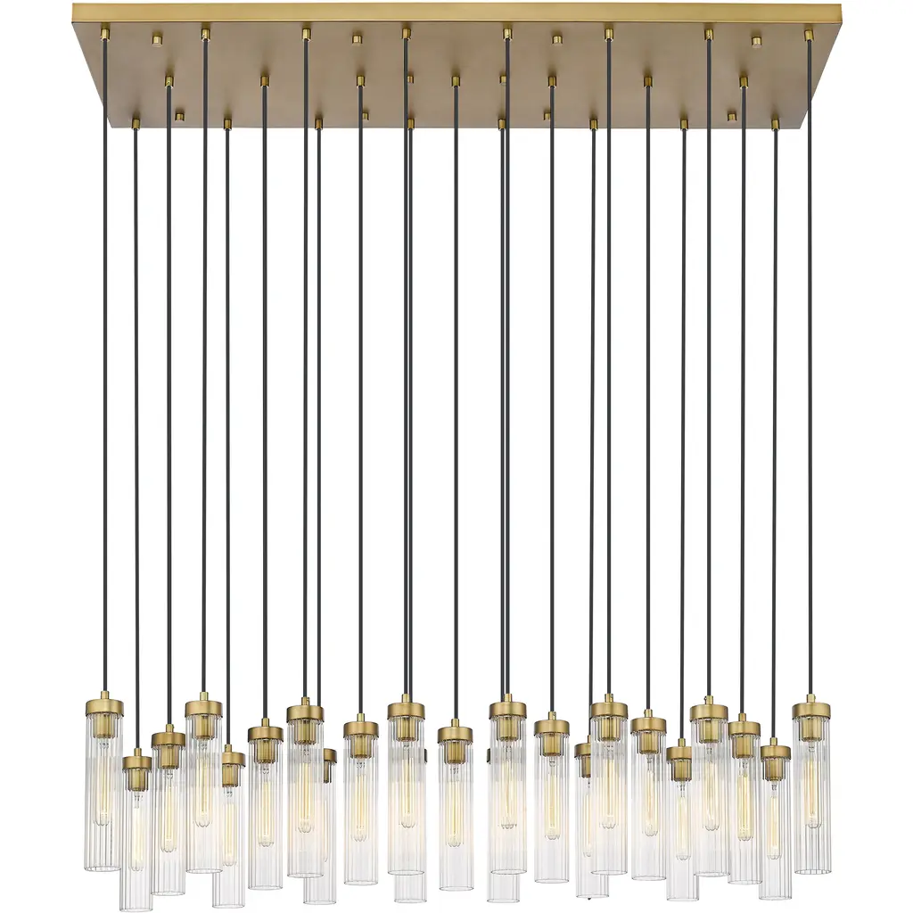 Create a veritable light show for ambient illumination and a glam artistic effect, choosing this 23-light linear chandelier to highlight an island, bar, or living area. Subtly delicate fluted glass shades form a simple yet impactful silhouette, enriching a contemporary setting. Rich rubbed brass finish metal comes to life when bulbs are lit, delivering decadent contrast.