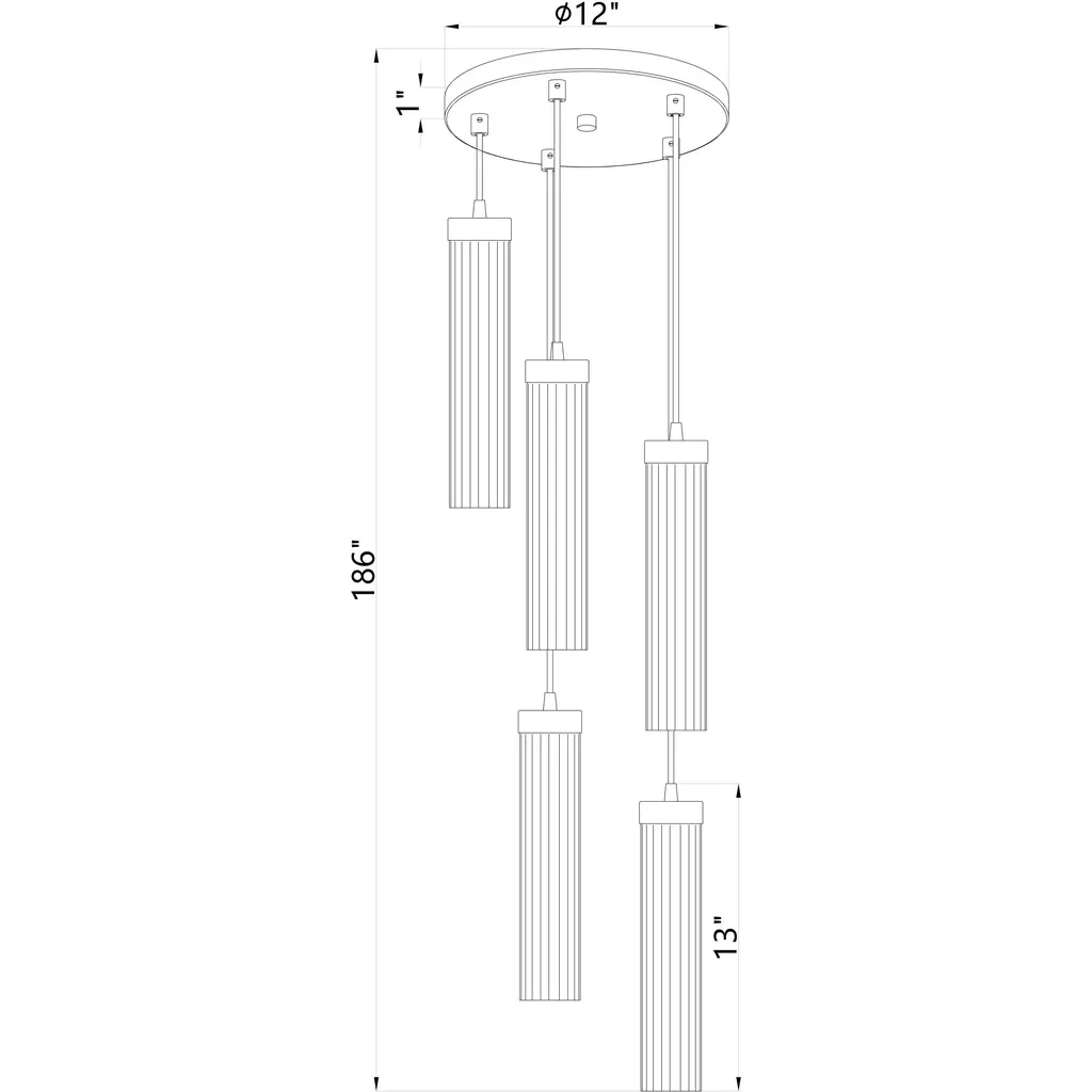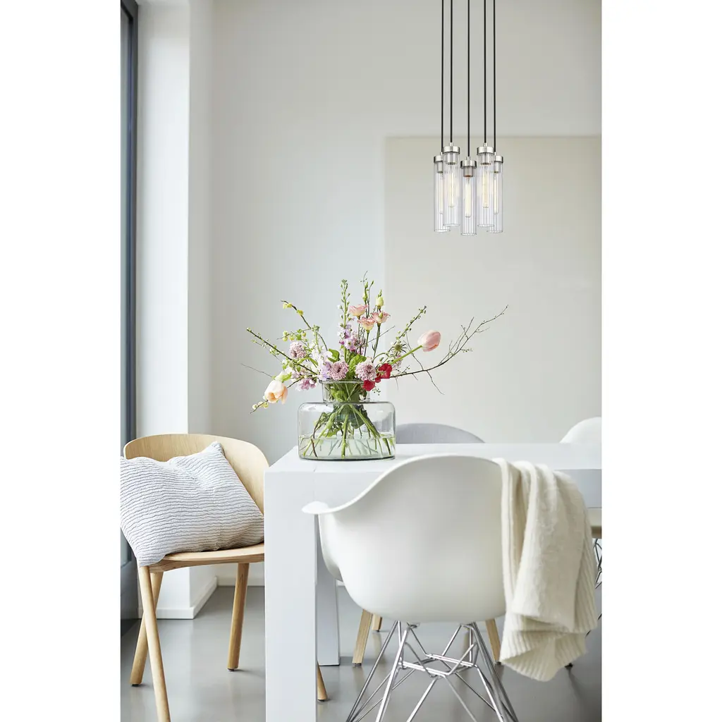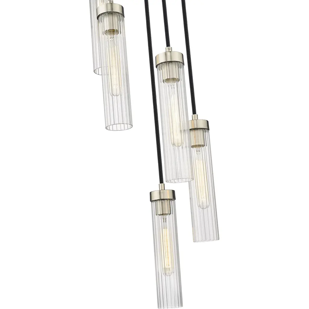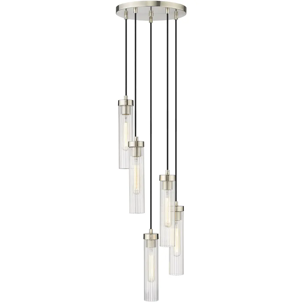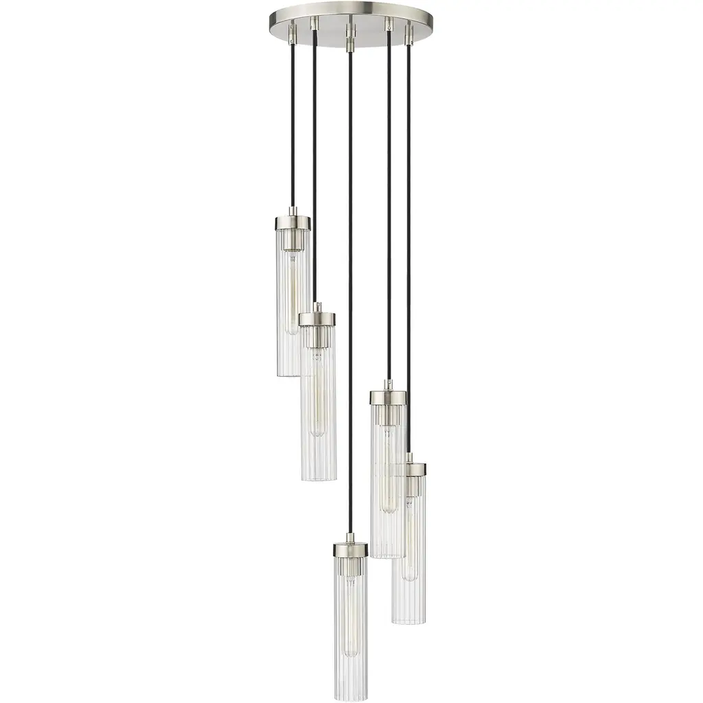 Iconic elegance is formed of a marriage between metal and glass shows gallery influence in this five-light round chandelier. Embrace the artisan glam and minimalist sensibility of a fixture featuring delicate fluted glass shades that dangle at graduated lengths from a cool brushed nickel finish metal canopy and contribute optical intrigue. This tasteful chandelier serves as a pendant for compact spaces including nooks, enclaves, and entryways.