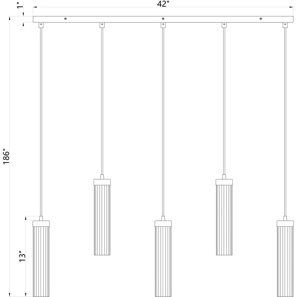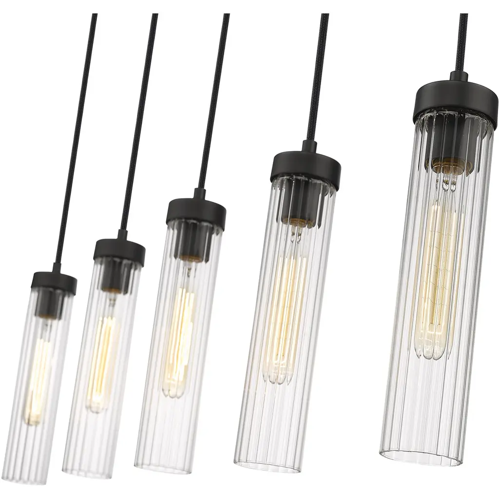 The design power of custom lighting intersecting with organic artistry offers unspoken elegance with a touch of minimalism and versatility. This five-light linear chandelier offers a row of delicate fluted glass shades that dangle in a graduated silhouette from a slender matte black finish metal canopy and form an example of organic expressive style. Shaping becomes an important element in the visual impact of a classic fixture.