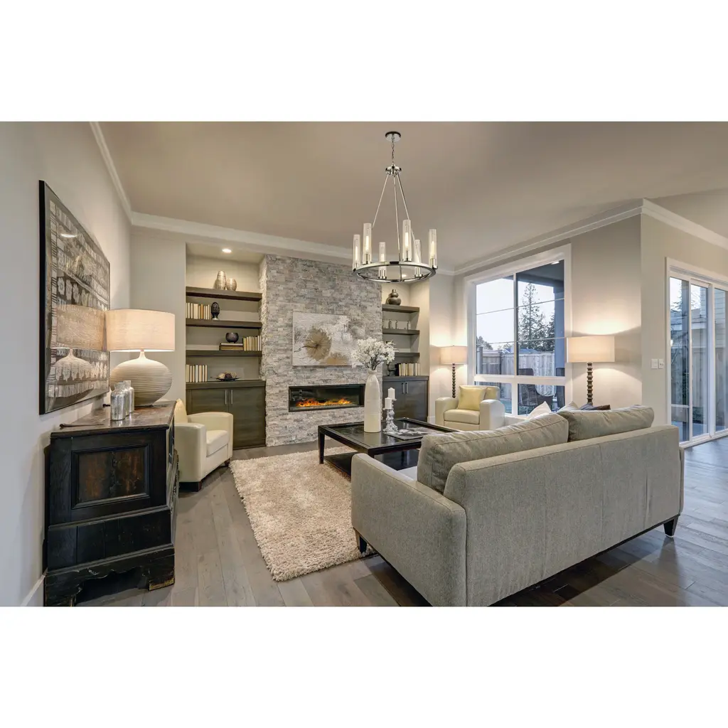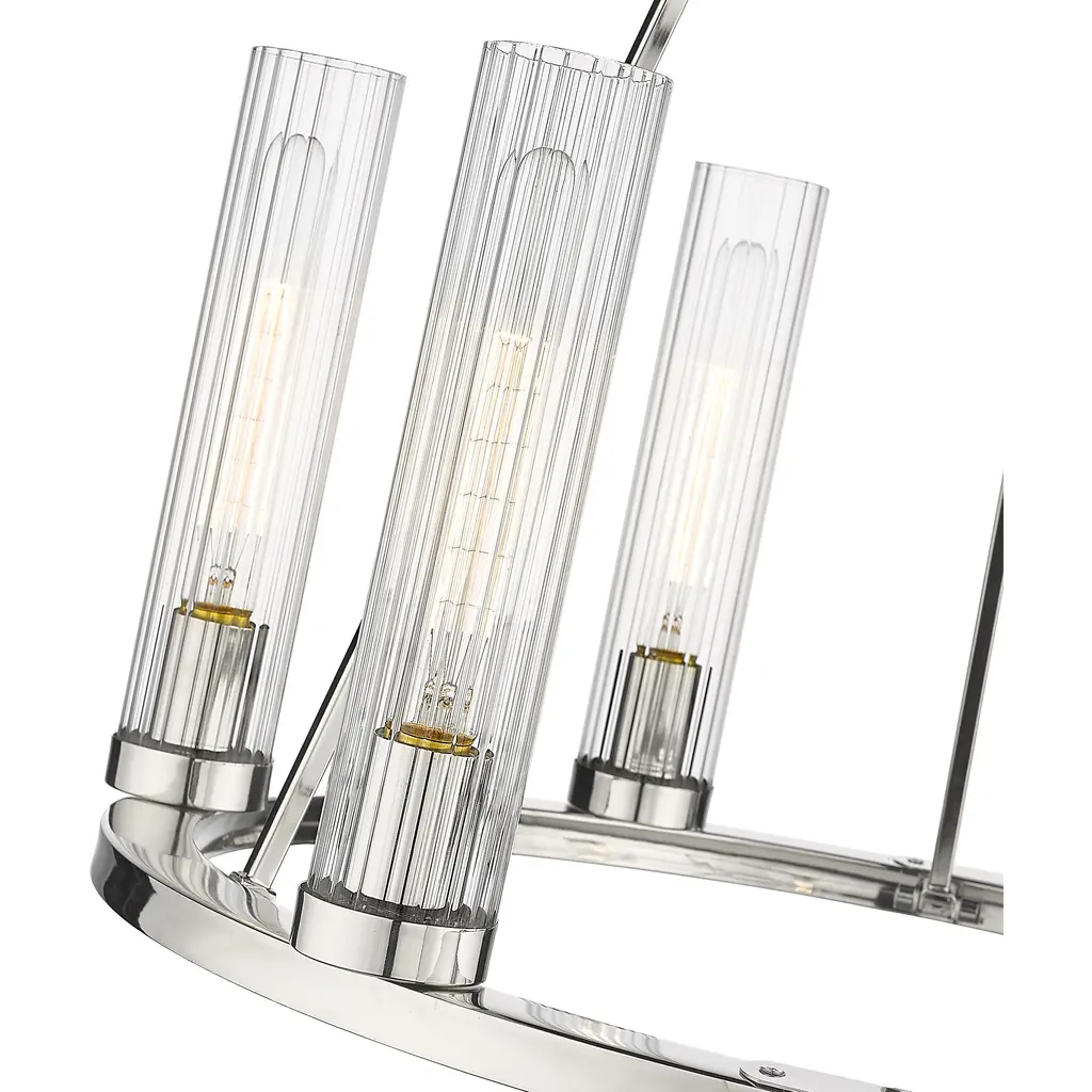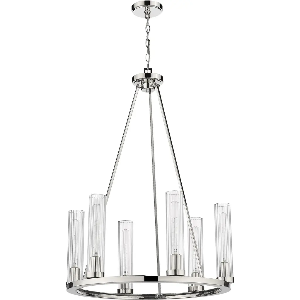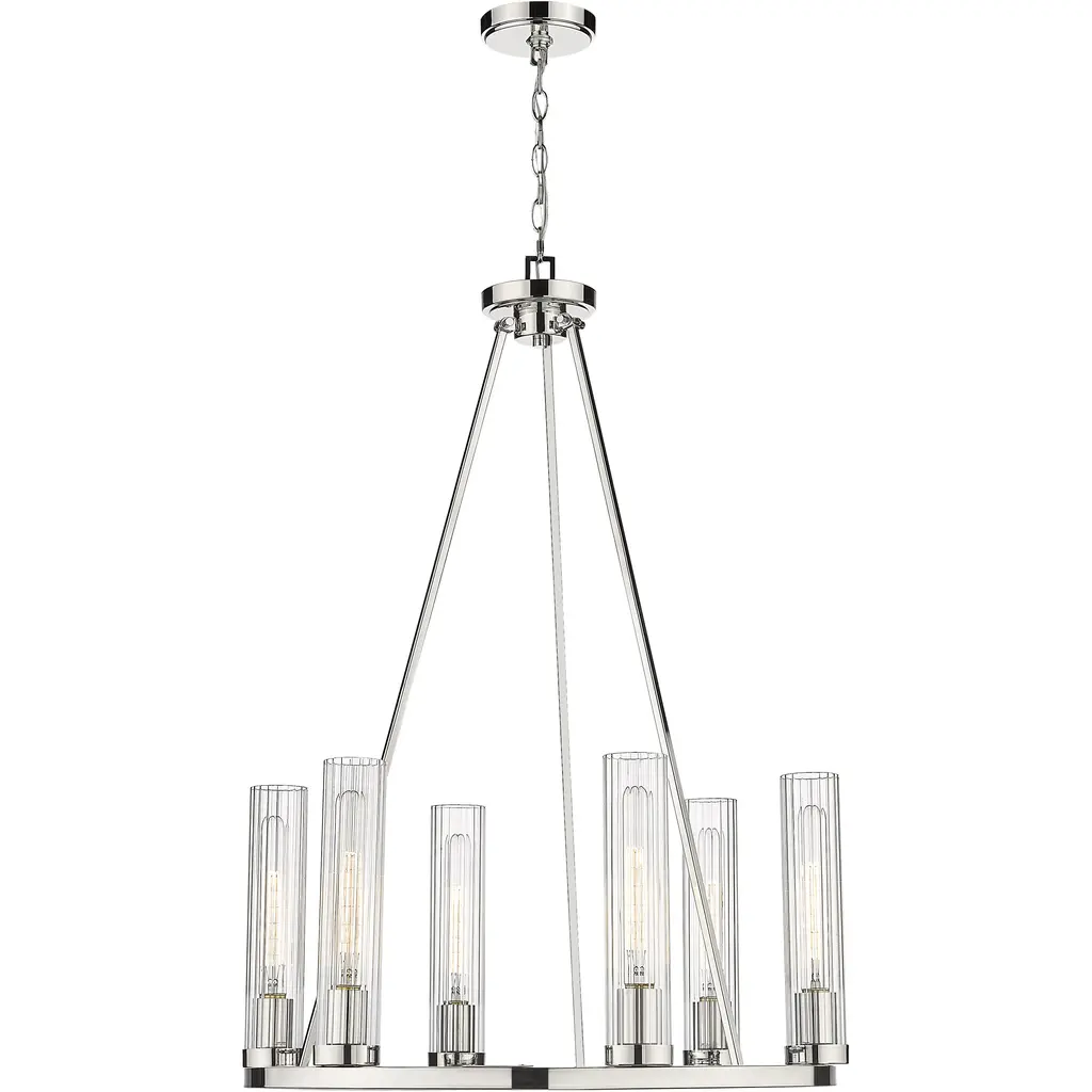 Gleaming polished nickel finish metal embellishes the sparkling glass shades that come to life in a modern space, transforming the Beau six-light chandelier into a sophisticated option for illuminating a compact living area. This design-forward fixture offers an unforgettable aesthetic with a shiny polished nickel steel frame and accents and evenly placed slender fluted glass shades. The consistency in materials speaks to an updated transitional theme that delivers versatility, a fresh feel, and a superb source of ambient lighting in a kitchen or living space.