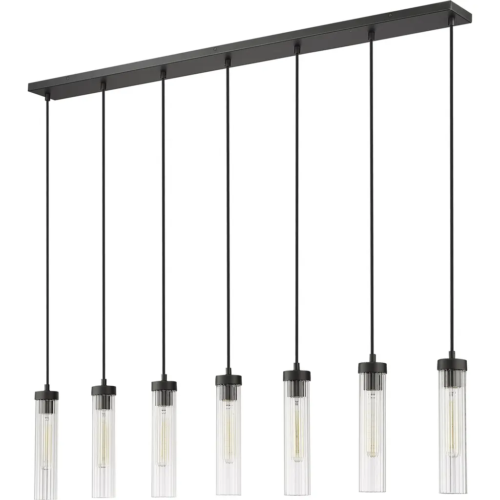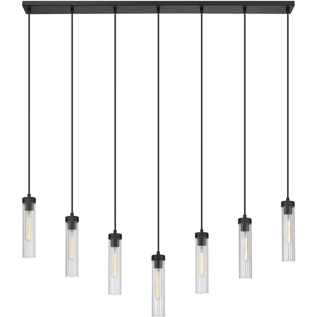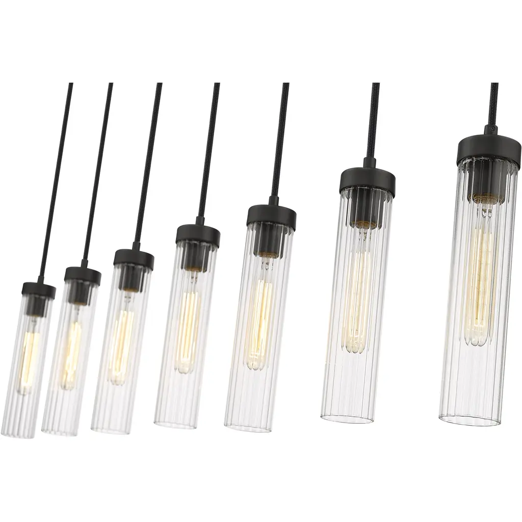 Welcome the orderly silhouetting and contrasting glam artistry of a light fixture with design power. Choose this seven-light linear chandelier to make a statement in a custom contemporary space, embracing a careful arrangement of delicate fluted glass shades that dangle at graduated lengths from a bold matte black finish metal canopy, delivering a captivating example of radiance and fluidity.