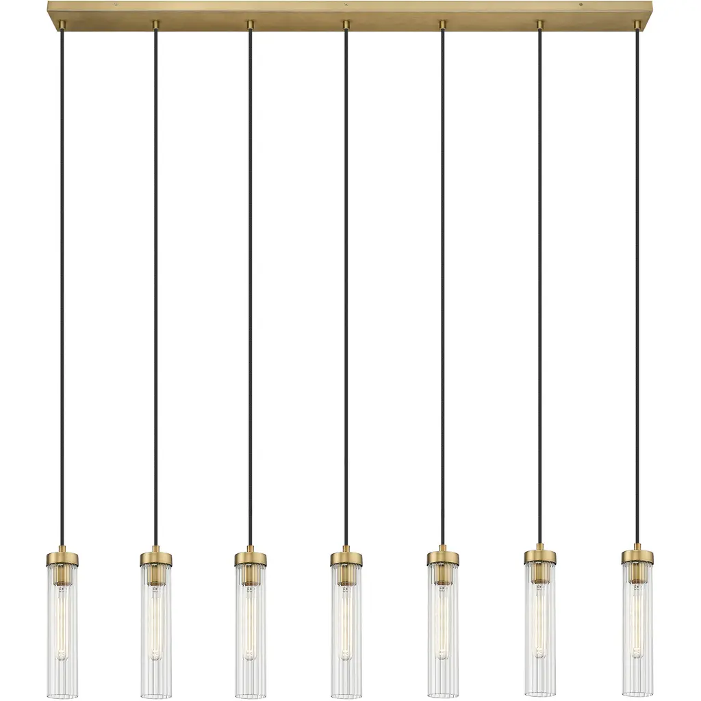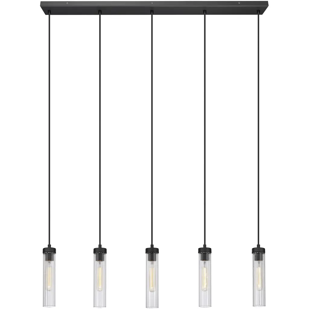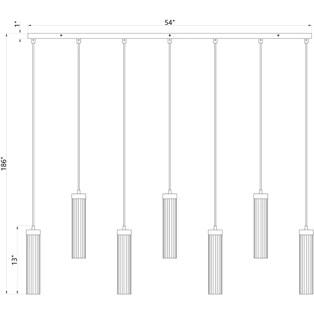 Welcome the orderly silhouetting and contrasting glam artistry of a light fixture with design power. Choose this seven-light linear chandelier to make a statement in a custom contemporary space, embracing a careful arrangement of delicate fluted glass shades that dangle at graduated lengths from a bold matte black finish metal canopy, delivering a captivating example of radiance and fluidity.
