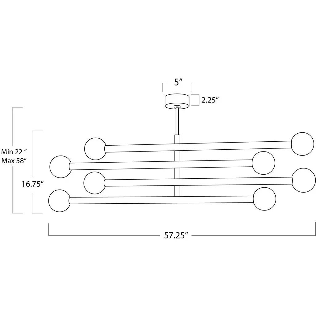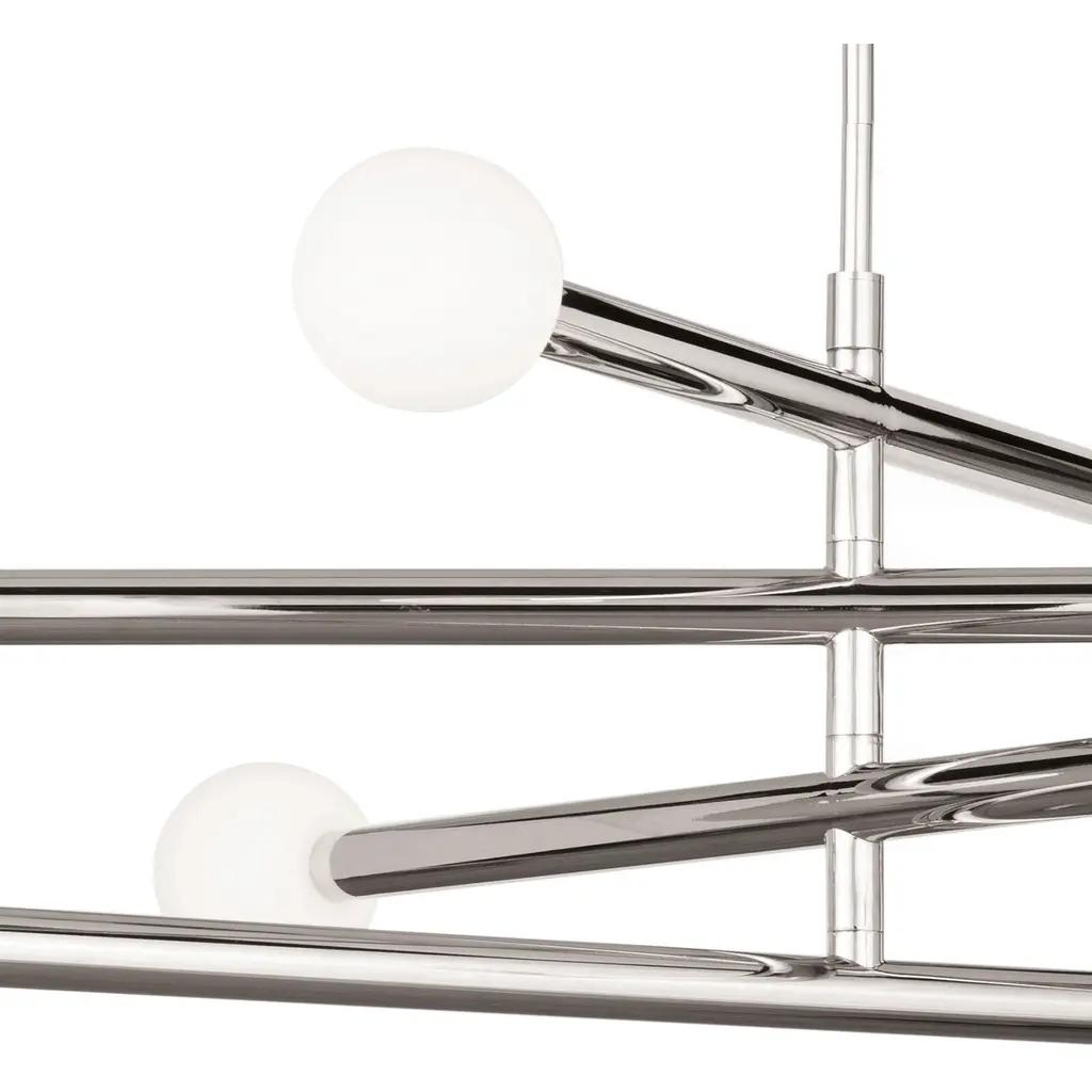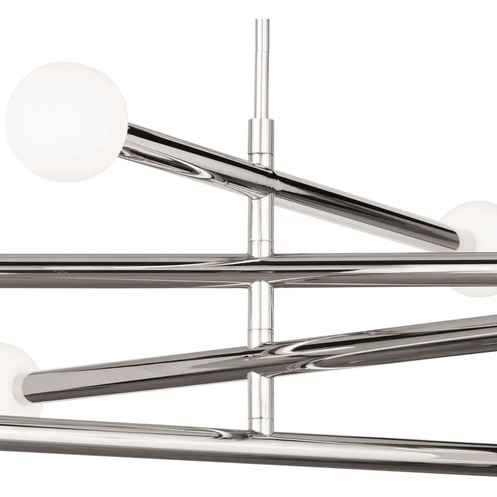 Four arms swivel around a center point on our modern, linear Beaubien Chandelier. Create a unique, dynamic design in your modern loft, entryway, or over a dining table. Beaubien's white glass, globe bulb covers add the perfect amount of diffused light to your space.